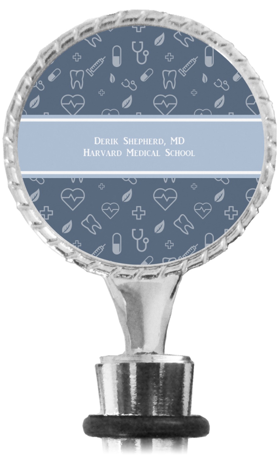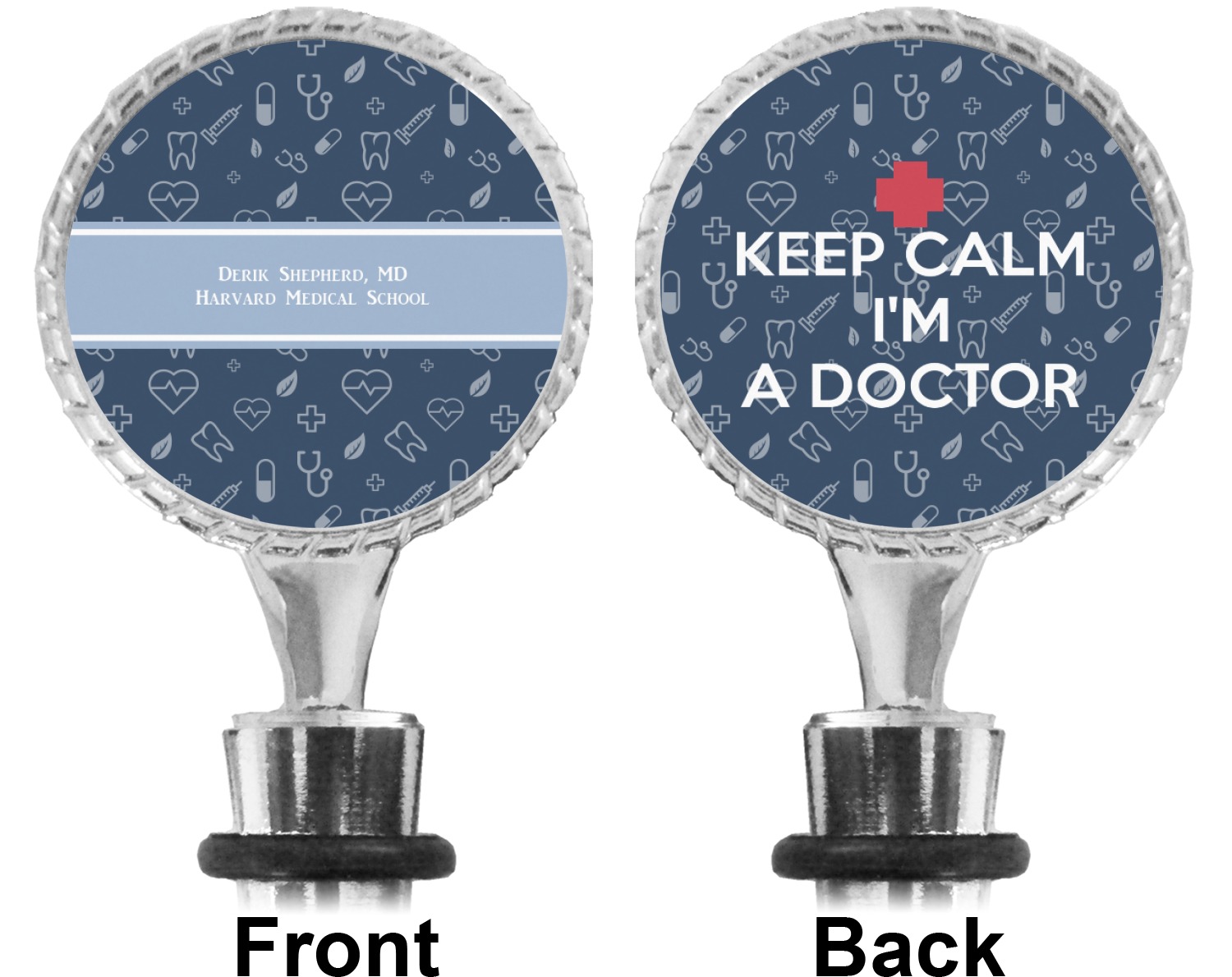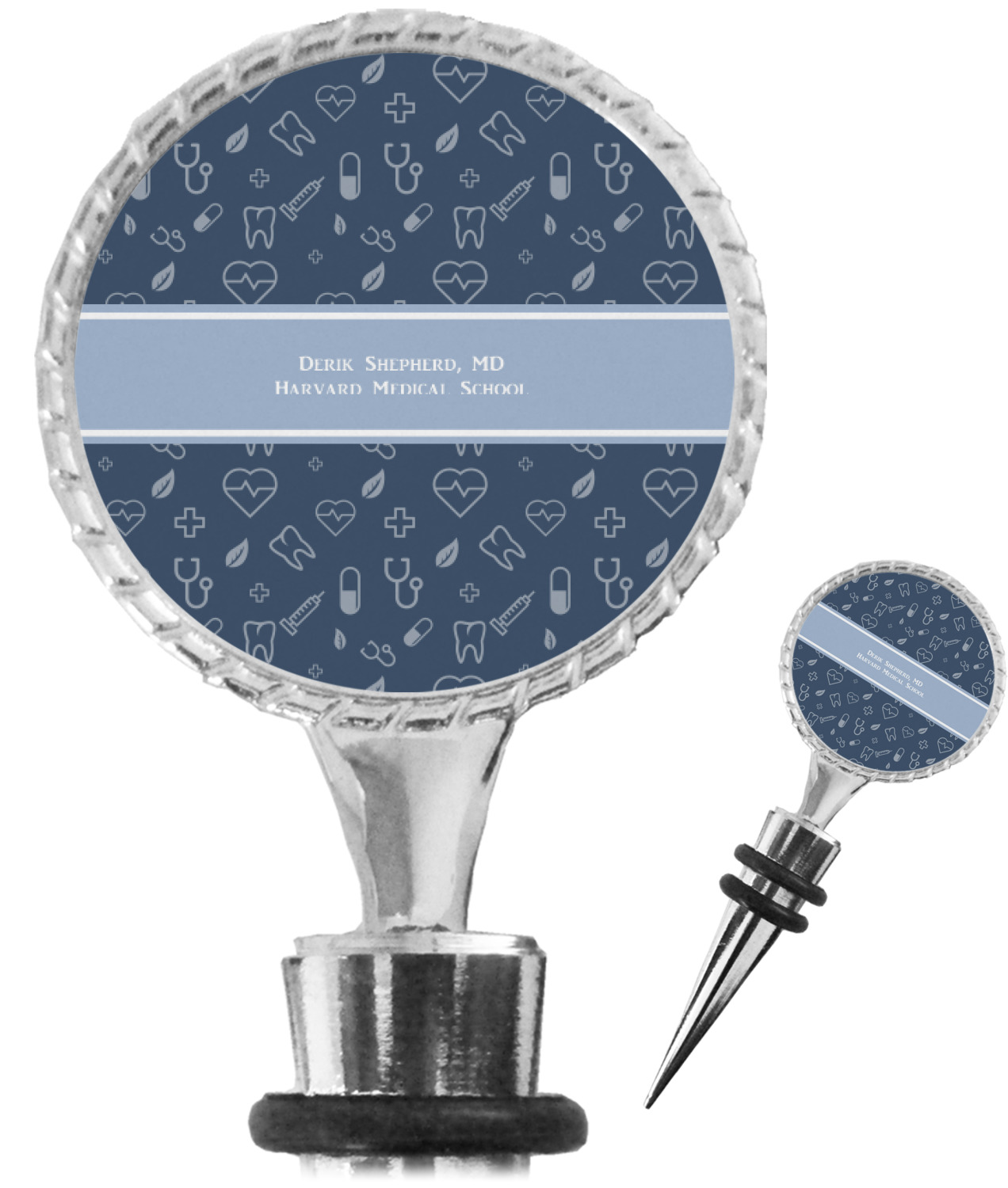 The top part of your bottle stopper is comprised of a zinc ring that displays your customization(s) in its middle, on both sides. The ring is heavy duty, with a bright chrome finish. The body of the wine stoppers have two silicone rings to provide an airtight seal. These wine bottle stoppers measure at 1.625" L x 0.8125" W x 4.625" H; your custom wine stopper is meant to fit into most standard-sized wine bottles.