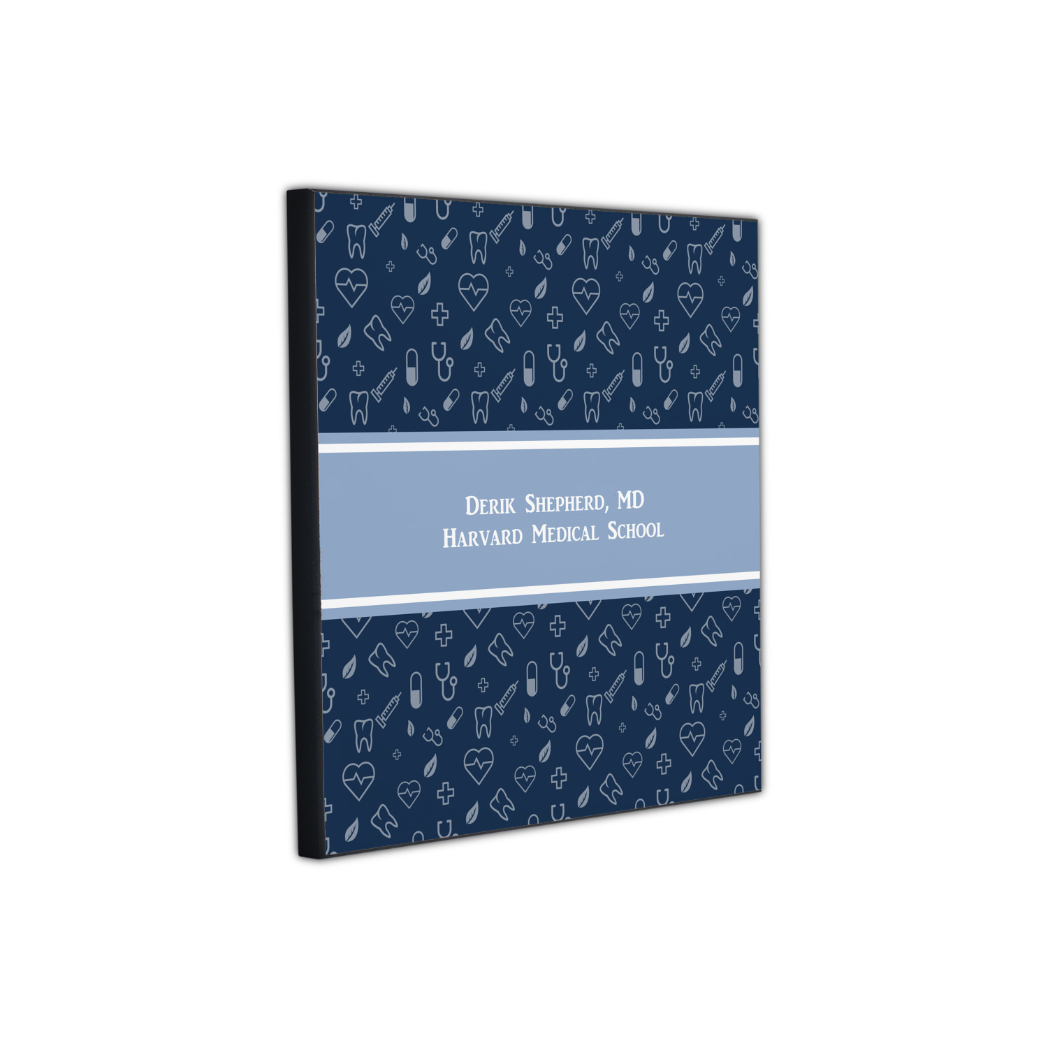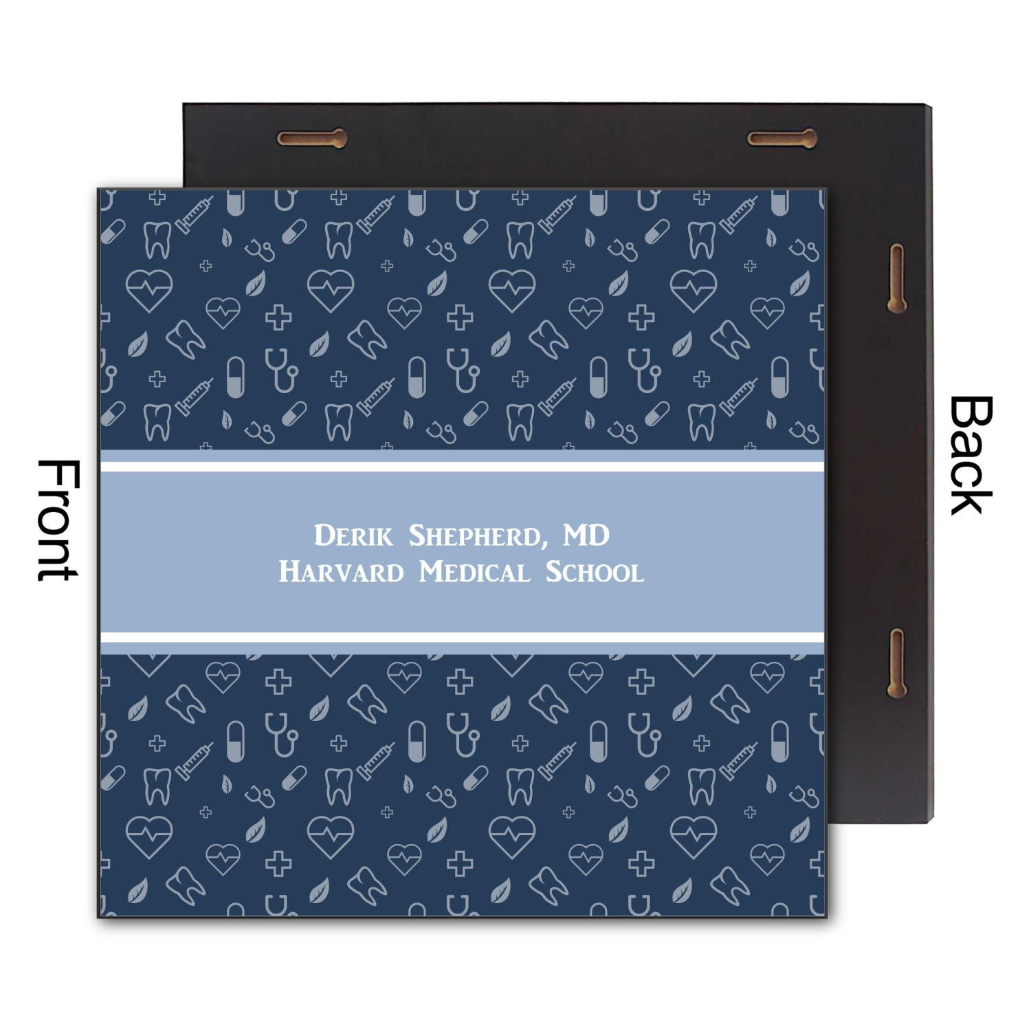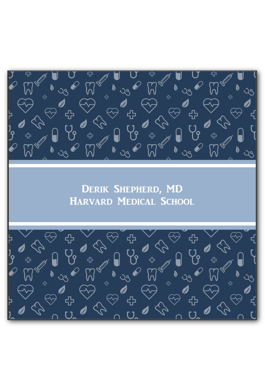 This design features a subtle background with different medical symbols. It is a navy blue with cream accents. There is a large ribbon where your personalization goes! The coordinating design features a quote that says "keep calm, I'm a doctor." This is such a fun design for any medical doctor!