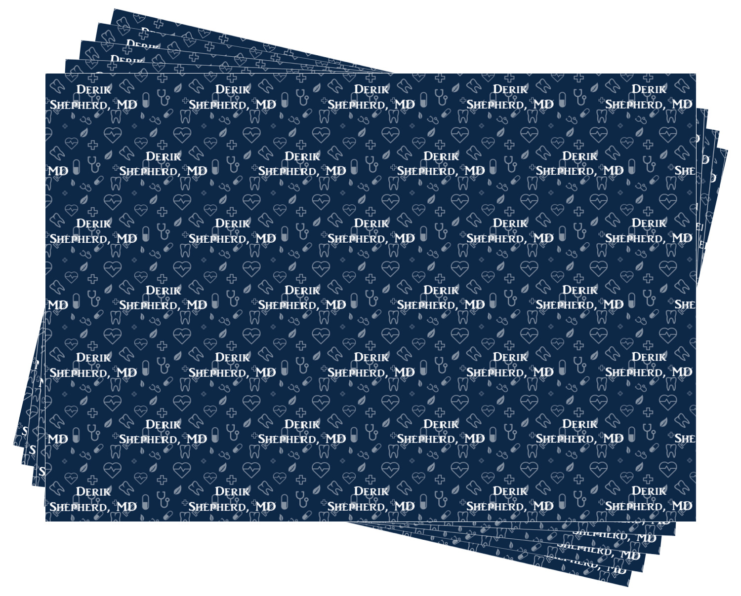 This design features a subtle background with different medical symbols. It is a navy blue with cream accents. There is a large ribbon where your personalization goes! The coordinating design features a quote that says "keep calm, I'm a doctor." This is such a fun design for any medical doctor!