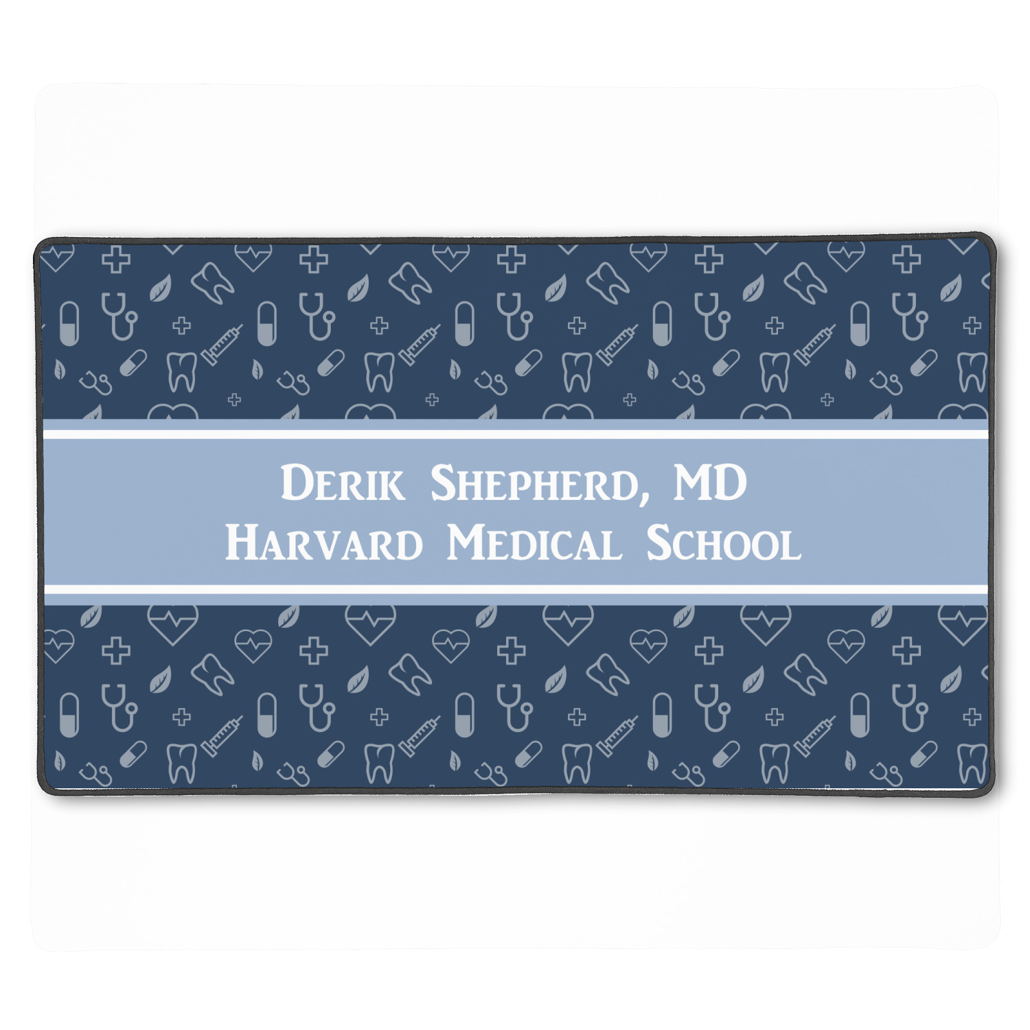 This design features a subtle background with different medical symbols. It is a navy blue with cream accents. There is a large ribbon where your personalization goes! The coordinating design features a quote that says "keep calm, I'm a doctor." This is such a fun design for any medical doctor!
