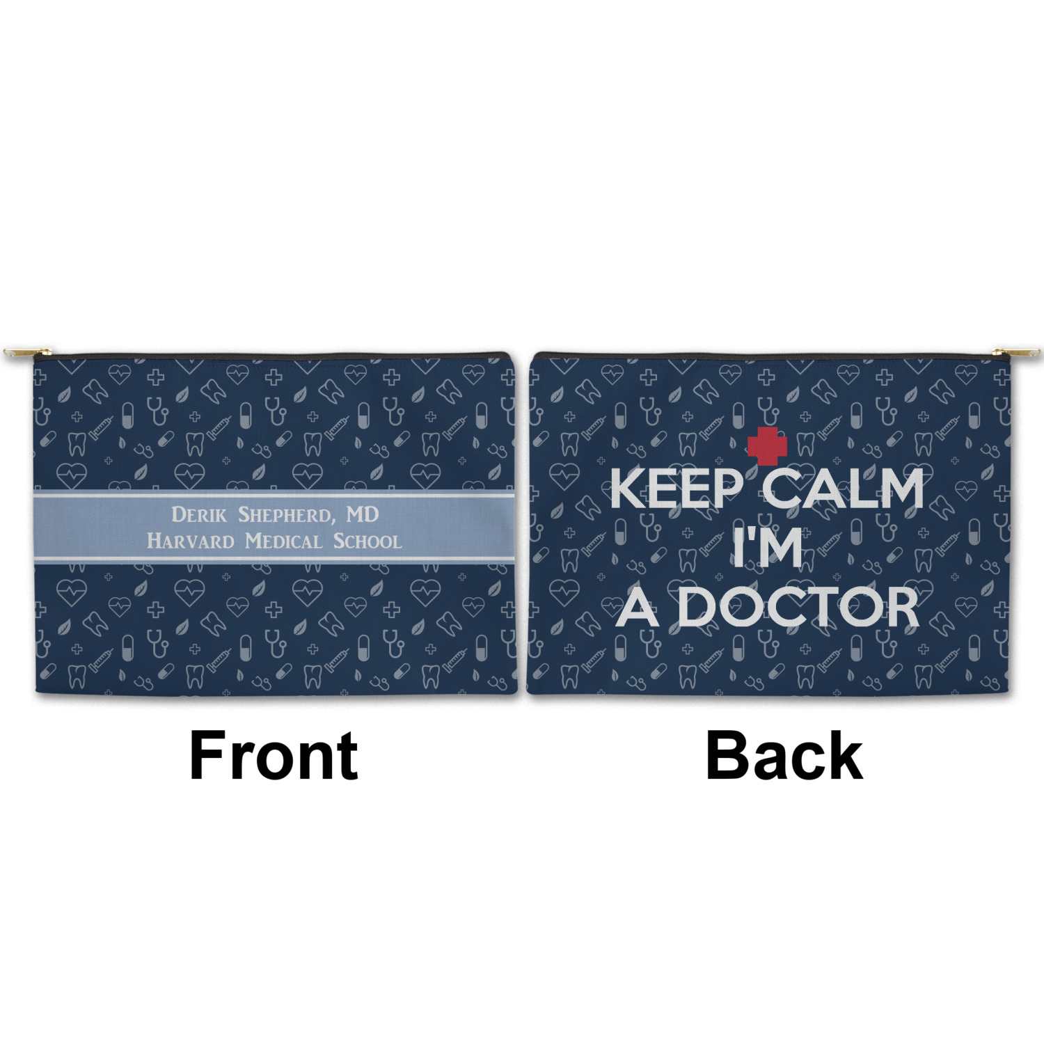 This design features a subtle background with different medical symbols. It is a navy blue with cream accents. There is a large ribbon where your personalization goes! The coordinating design features a quote that says "keep calm, I'm a doctor." This is such a fun design for any medical doctor!
