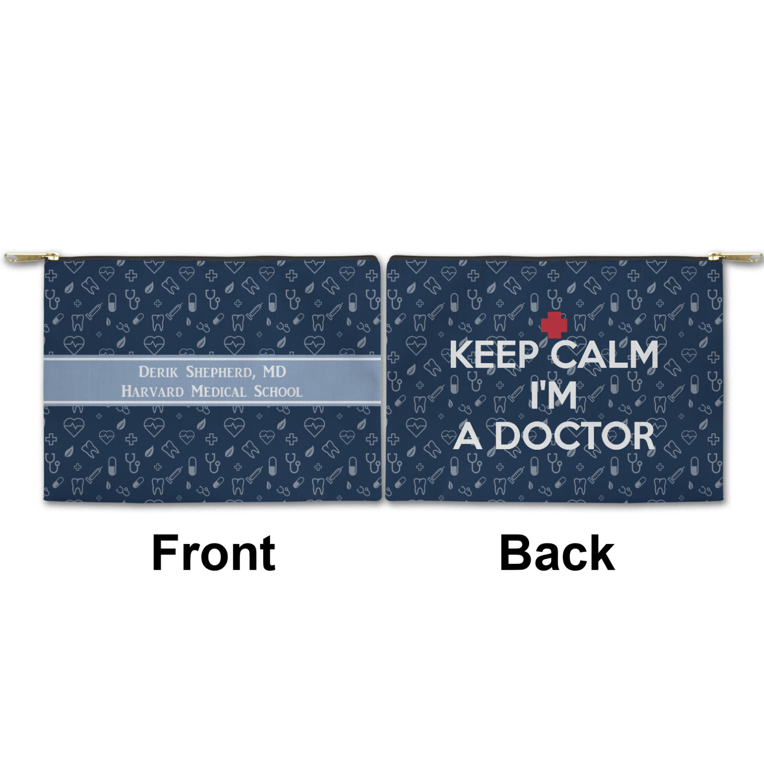 This design features a subtle background with different medical symbols. It is a navy blue with cream accents. There is a large ribbon where your personalization goes! The coordinating design features a quote that says "keep calm, I'm a doctor." This is such a fun design for any medical doctor!