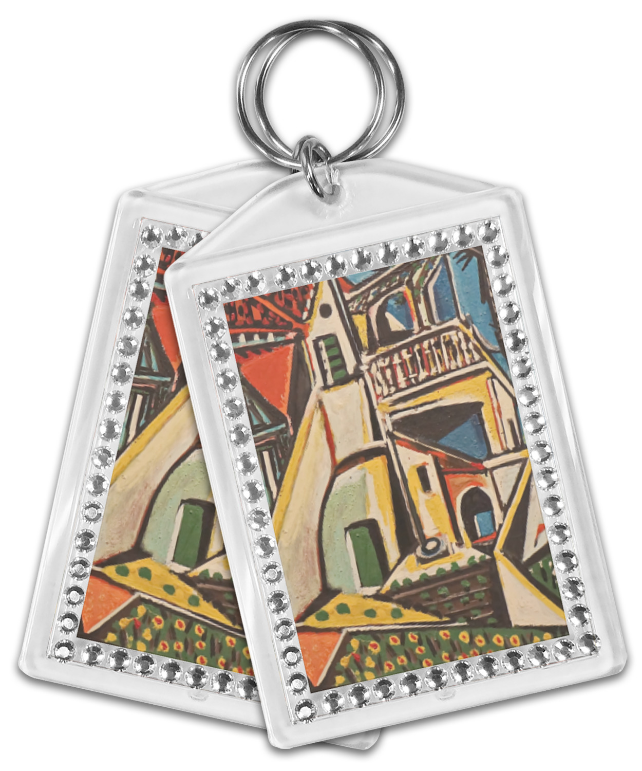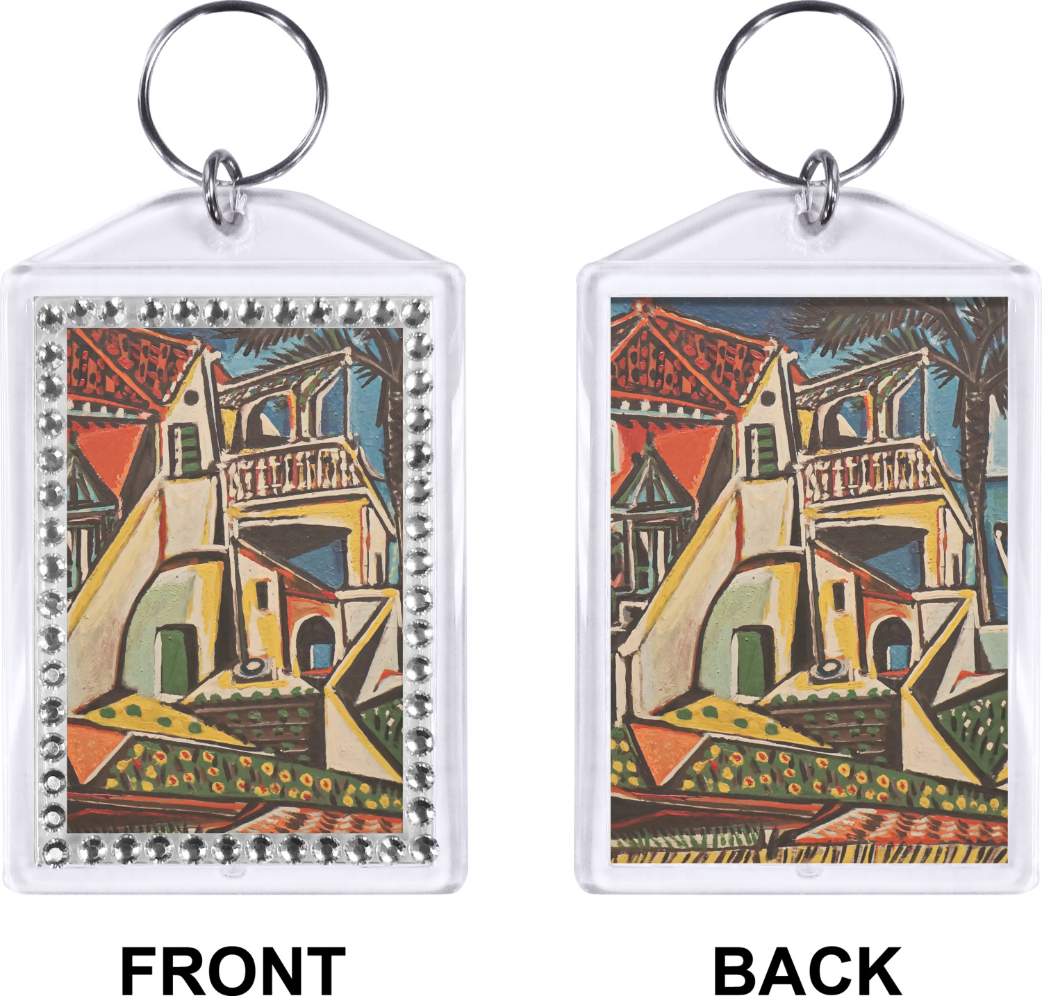 Our personalized keychains have a bold, rectangular shape, outlined by a series of shimmering rhinestones. A metal, split keyring is included with your purchase, and an additional metal hoop allows for attachment of the keychain to the split ring. This unique keychain measures at about 3.75 by 2.5 inches. We print your customized design(s) across both the back and front of this keychain.