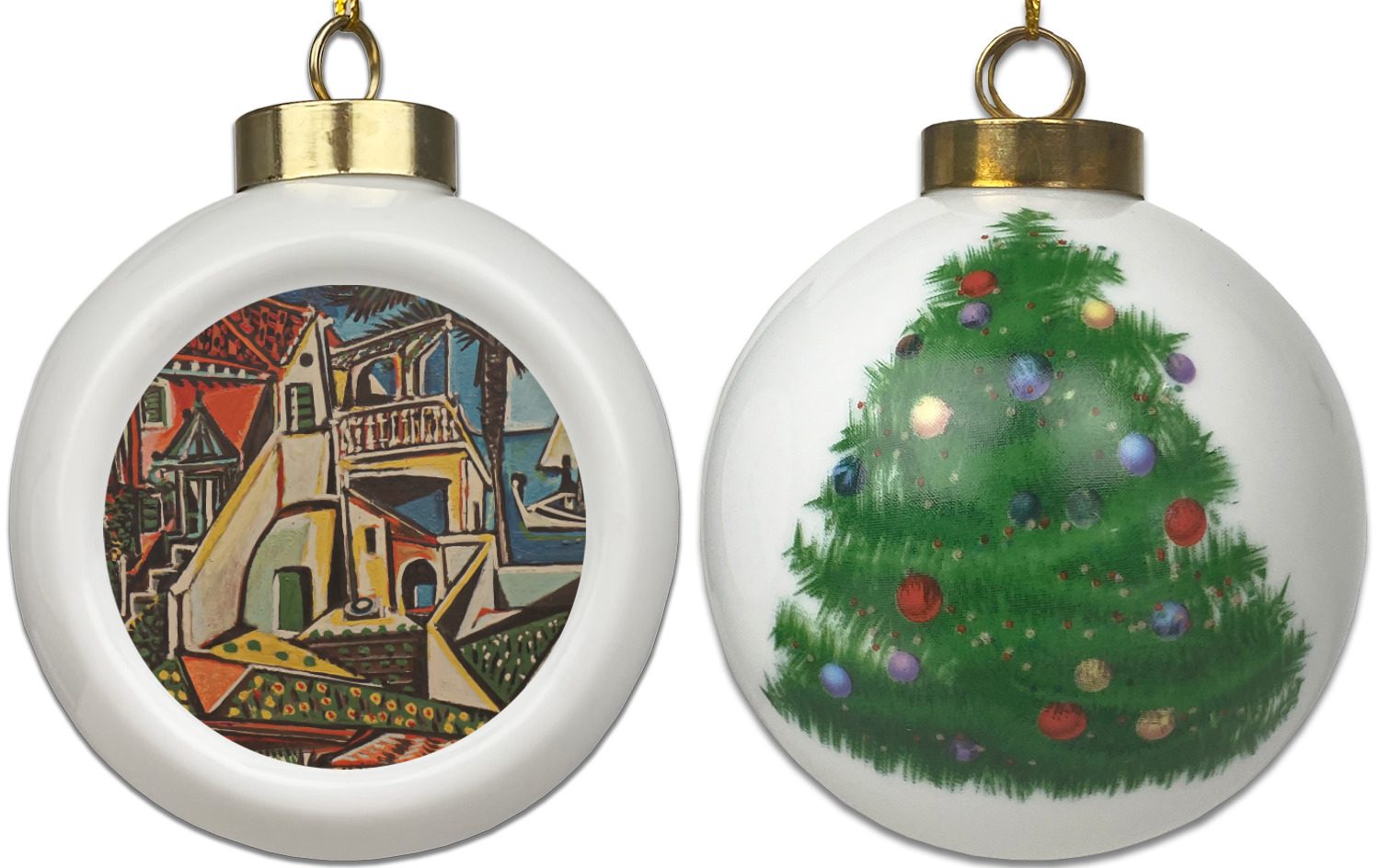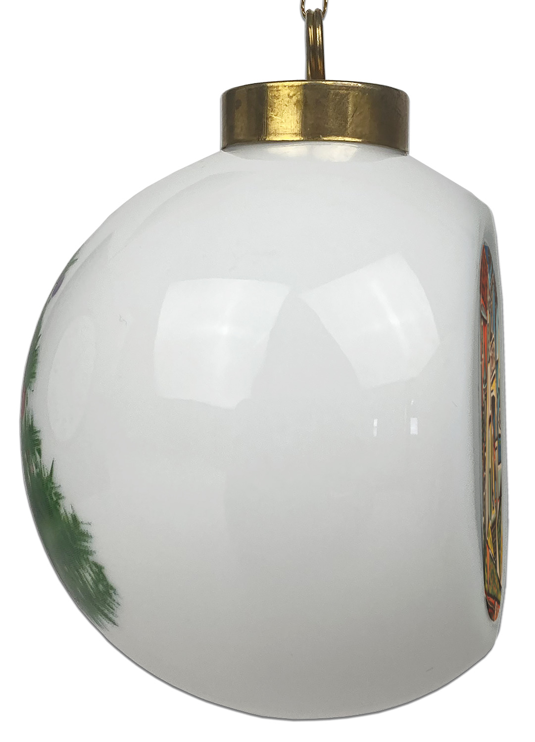 Our Christmas ornaments are a unique ceramic ball shape with a twist as it has a flat face to display your custom design! Select from one of our two design types - Christmas Tree or Poinsettia Garland - to adorn the curved back of your personal design. Each ornament measures 3H x 2.5W x 2D accompanied with a gold string accent for finishing touches to hang on your beautiful Christmas tree!