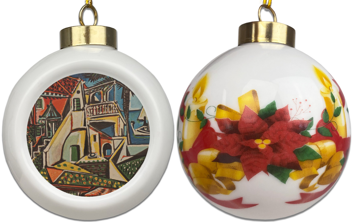 Our Christmas ornaments are a unique ceramic ball shape with a twist as it has a flat face to display your custom design! Select from one of our two design types - Christmas Tree or Poinsettia Garland - to adorn the curved back of your personal design. Each ornament measures 3H x 2.5W x 2D accompanied with a gold string accent for finishing touches to hang on your beautiful Christmas tree!