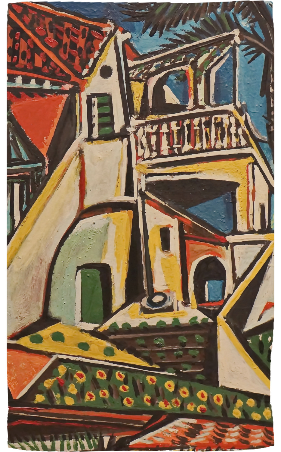 This particular piece was completed in 1952, after Picasso's cubism style was developed. The choppy and irregular shapes resemble a collage or synthetic cubism. Synthetic cubism is the use of cut paper fragments, wallpaper or newspaper, pasted together in order to create a composition. This style was a way to analyze objects by their shape.