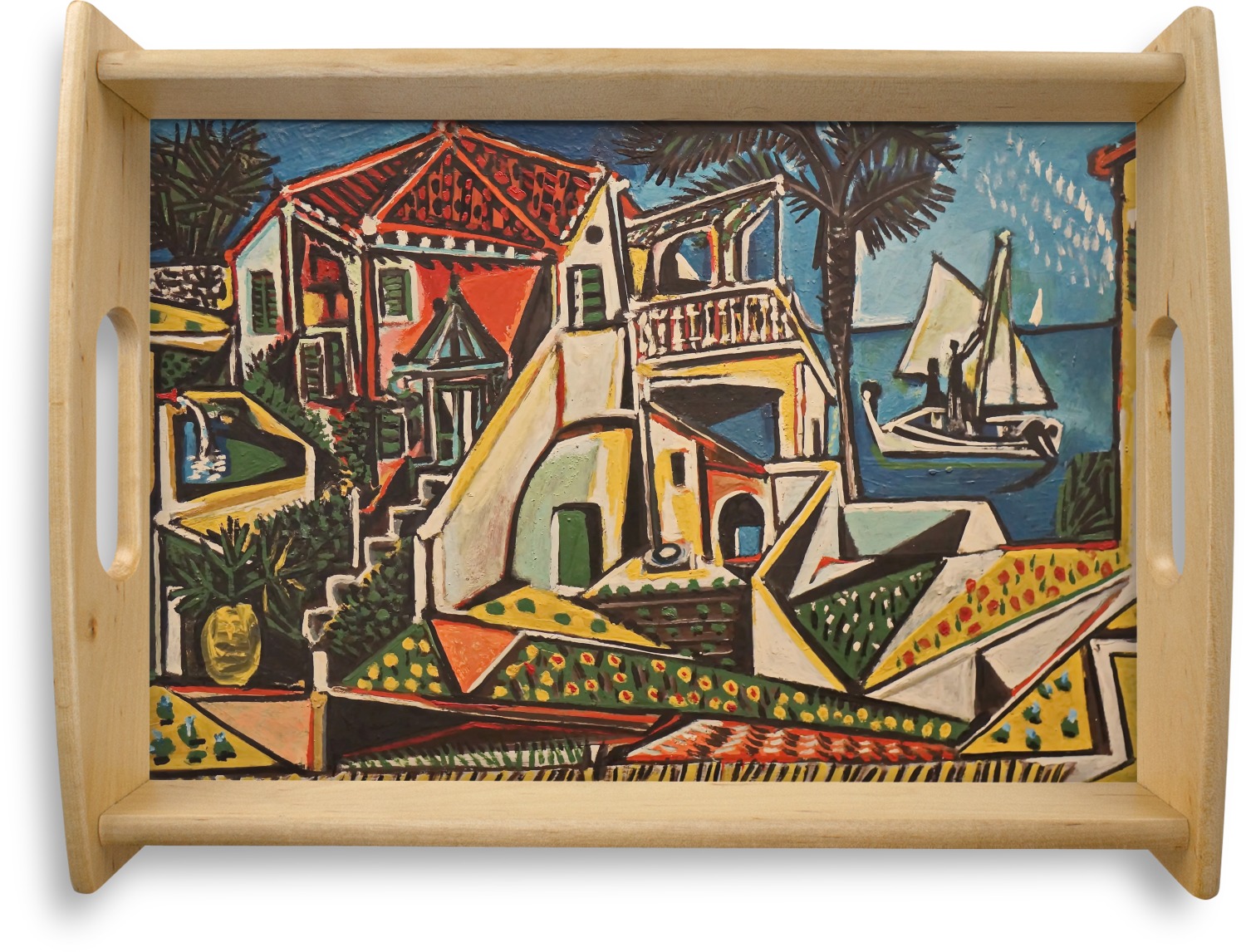 This serving tray with handles features square edges and two rounded sides, creating a very modern look. Each side is fabricated from a beautifully cut, natural wood. The bottom of the interior of the tray displays your customized design in bright, vibrant color. The tray is sold in both a black color and a natural wood look. Each variation of the wood serving tray has two sizes: Small, which is 14" x 10" x 2.25", and Large, which is 19.5" x 13.5" x 2.75".