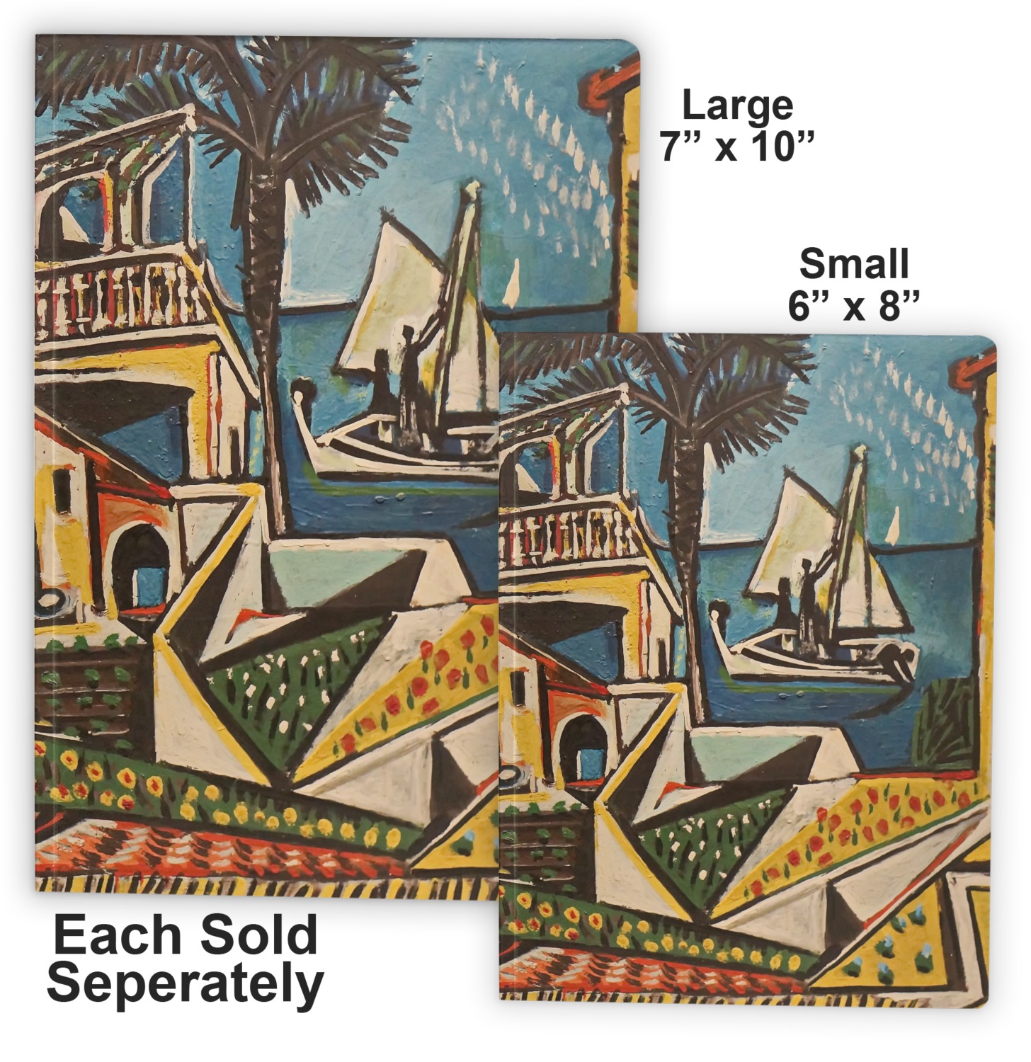 We offer these notebooks in two different sizes. The small notebook is 8" x 5.75", and fits snugly in purses or totes. The large notebook measures at 10" x 7.25", and can be carried in briefcases and backpacks.