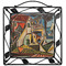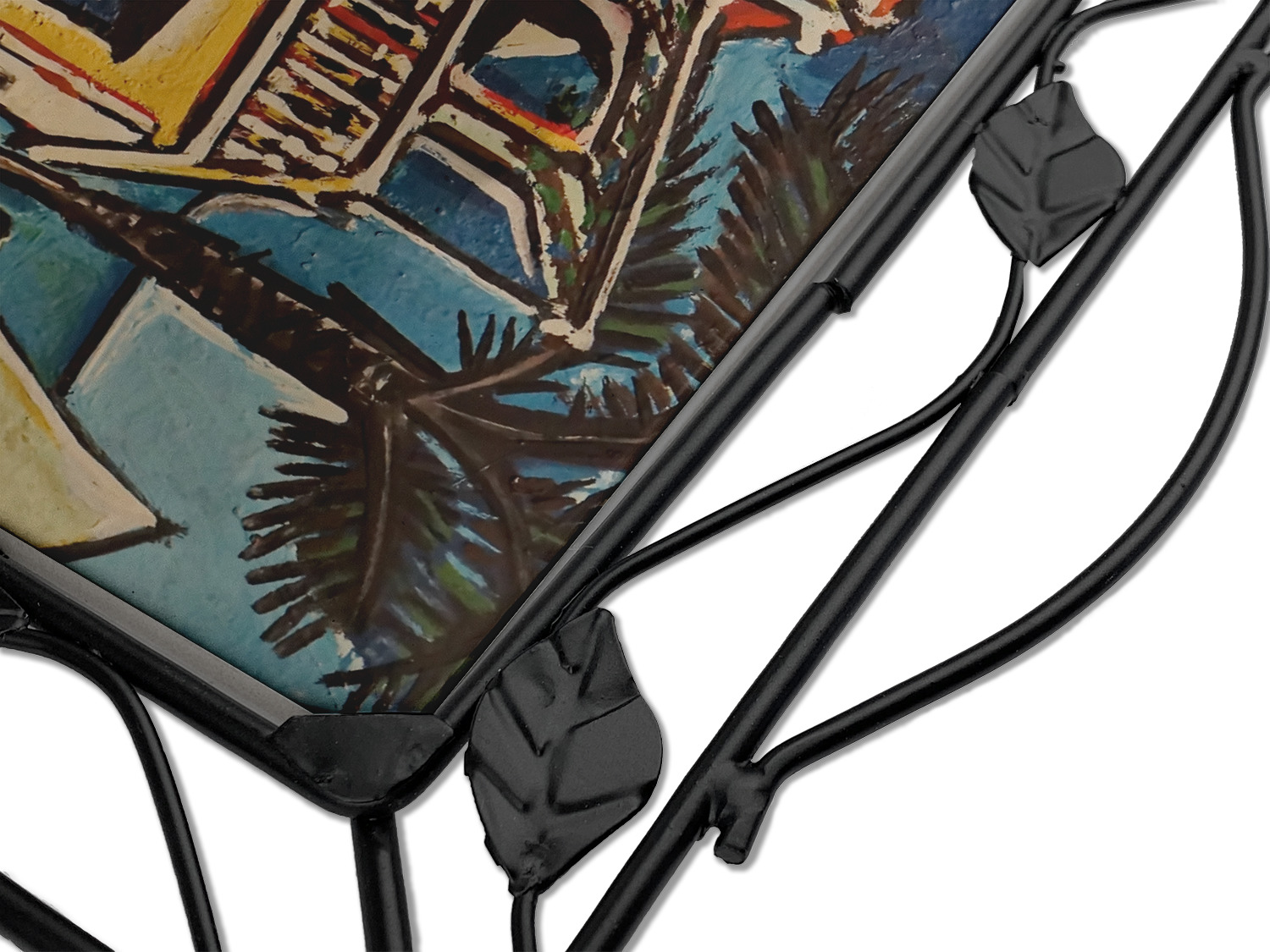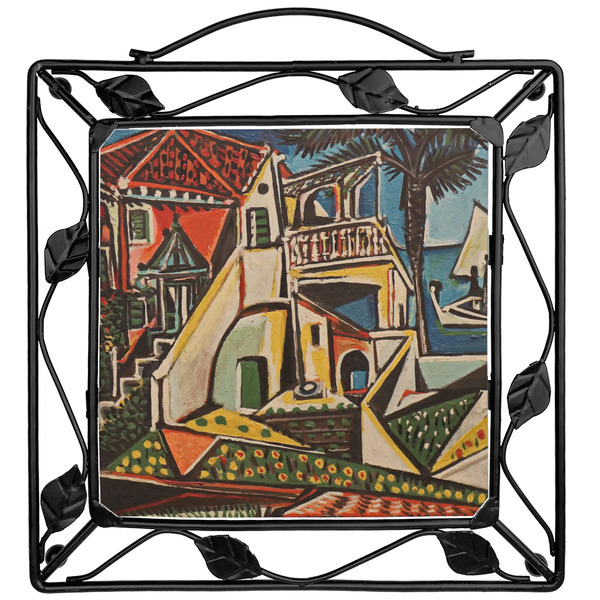 Our square trivets are made from a durable, wrought iron. This model features 4 small half circles, one on each corner, and a larger ring of iron that circles the central, customized tile. Each of the 4 corners has a round foot on its bottom for stability. This trivet is 8.75 by 8.75 inches, but the central tile measures at 6 inches on both sides.
