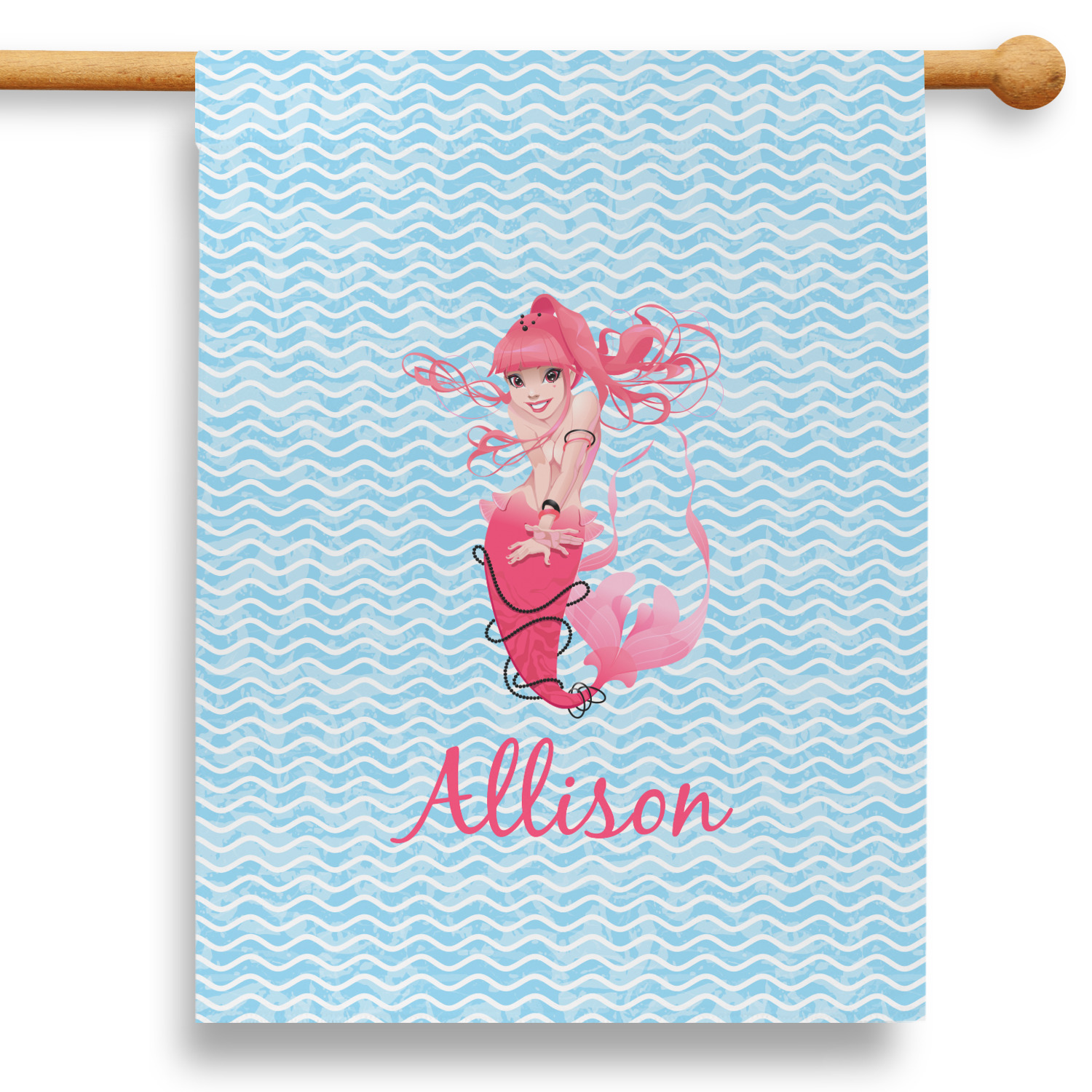 Start your deep sea adventure with this whimsical Mermaid design. Our design shows a playful mermaid with pink hair and tail with black beads on dynamic blue waves. We have other mermaids including some more suitable for younger girls in our system, so you can always change out the mermaid graphic.