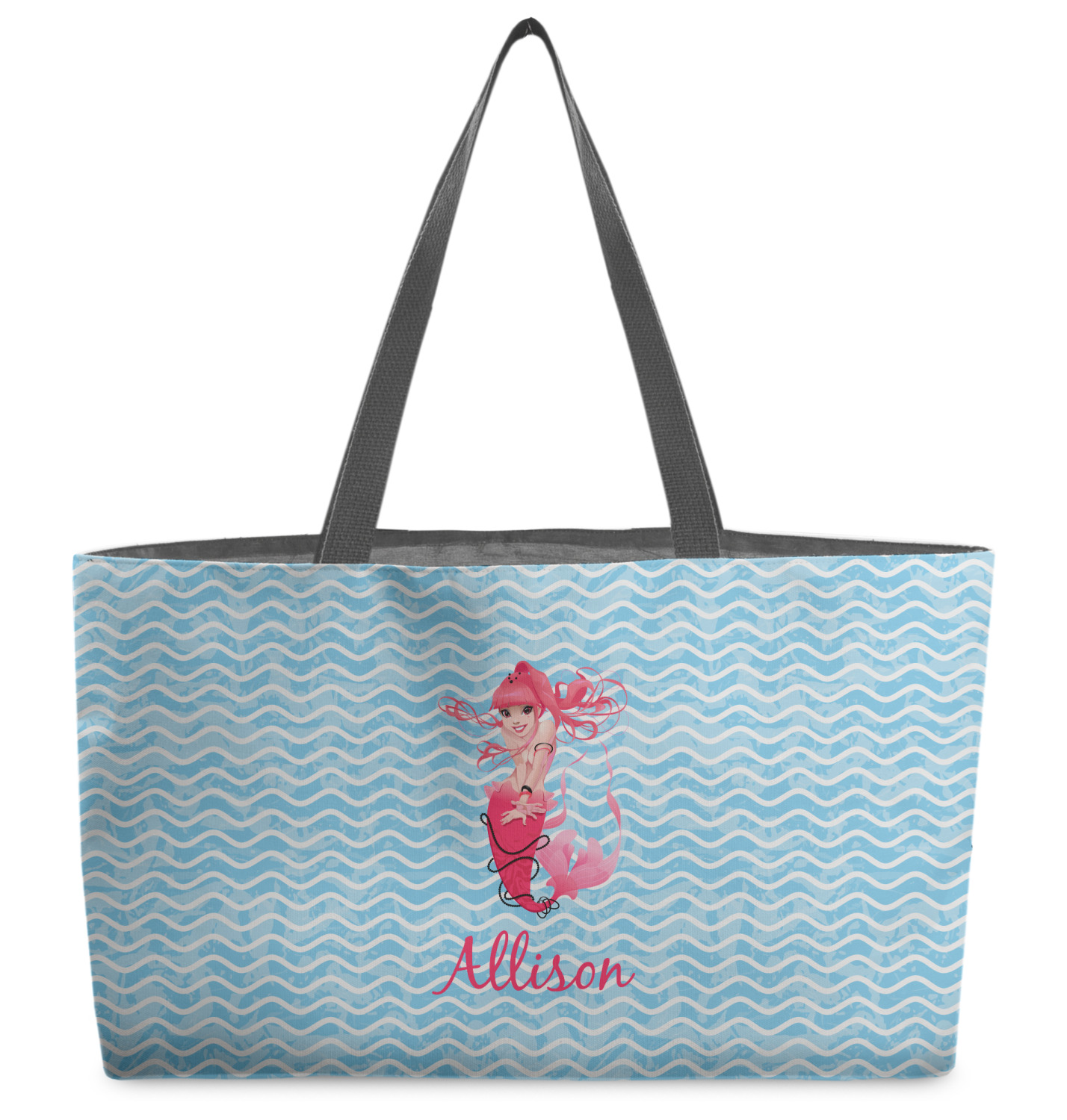 These beach totes are handmade here in the USA. Fabric is printed with your design. The tote is then sewn from the fabric pieces, lining and handles added.