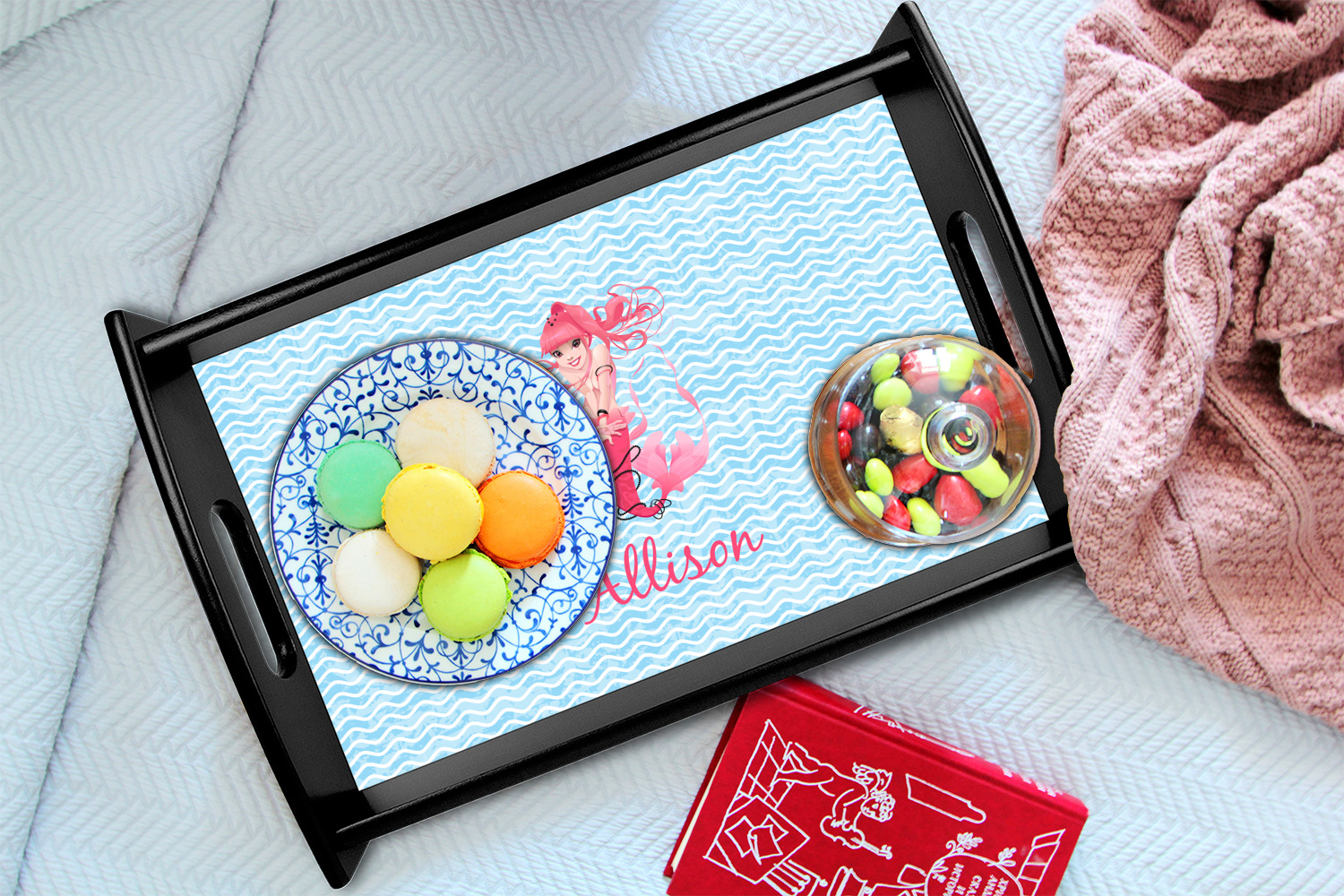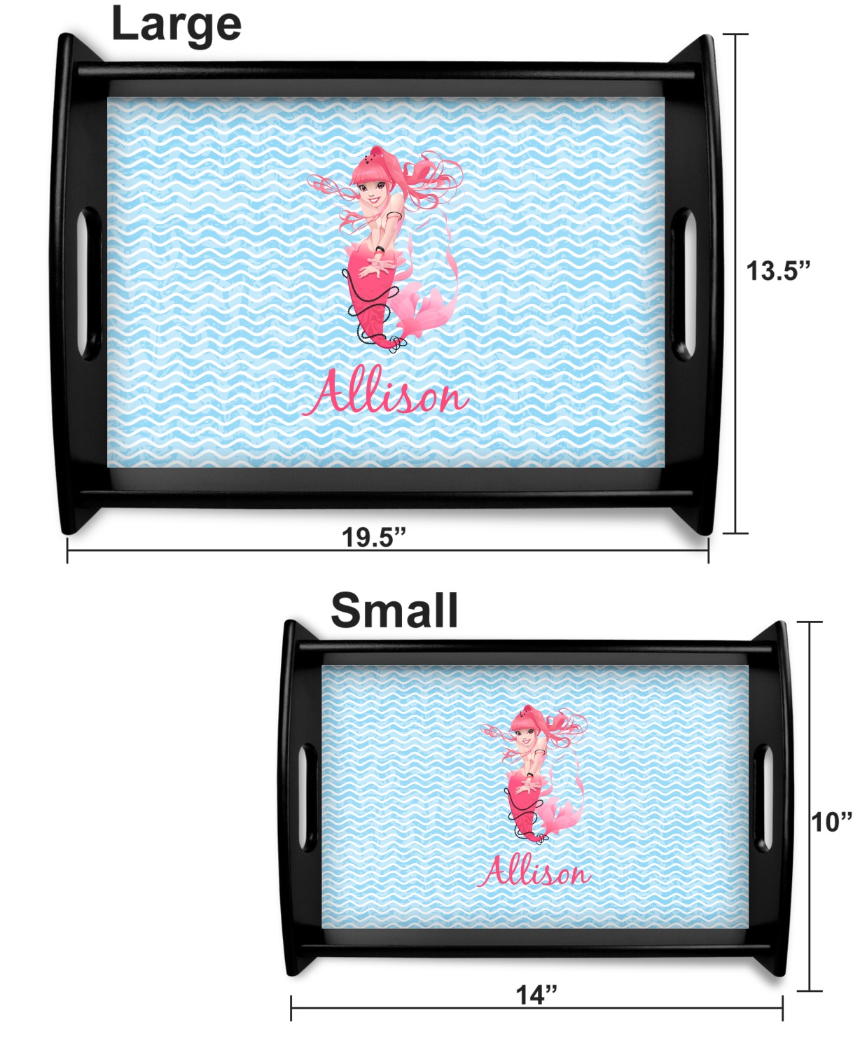 This serving tray with handles features square edges and two rounded sides, creating a very modern look. Each side is fabricated from a beautifully cut, natural wood. The bottom of the interior of the tray displays your customized design in bright, vibrant color. The tray is sold in both a black color and a natural wood look. Each variation of the wood serving tray has two sizes: Small, which is 14" x 10" x 2.25", and Large, which is 19.5" x 13.5" x 2.75".