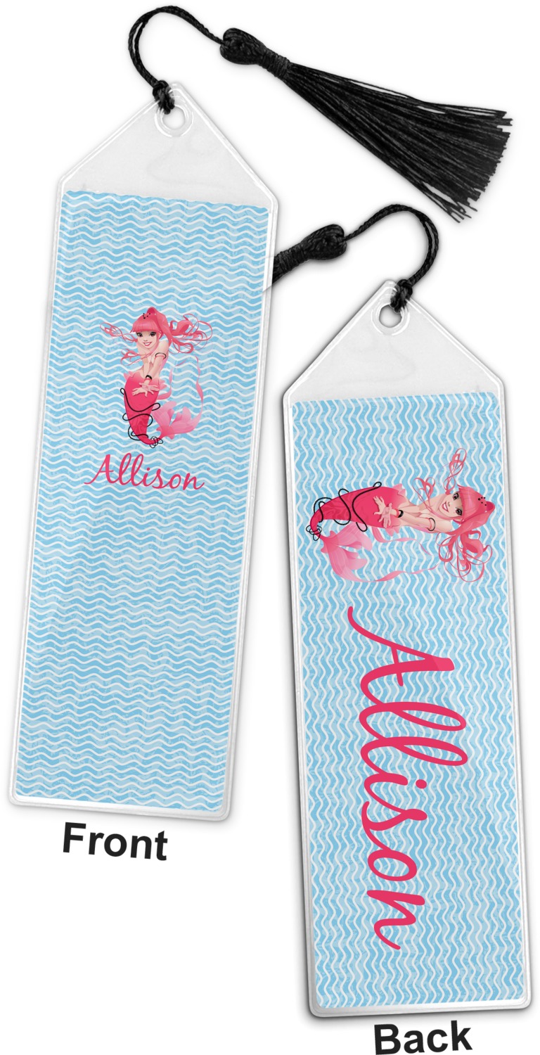 Your personalized bookmark is made of a sturdy, clear vinyl, and is approximately 7.5" x 2.25". We display your personalization on vinyl inserts that are placed on both sides. Accompanying each book marker is a black, fringe tassel that attaches to the reinforced, triangular header.
