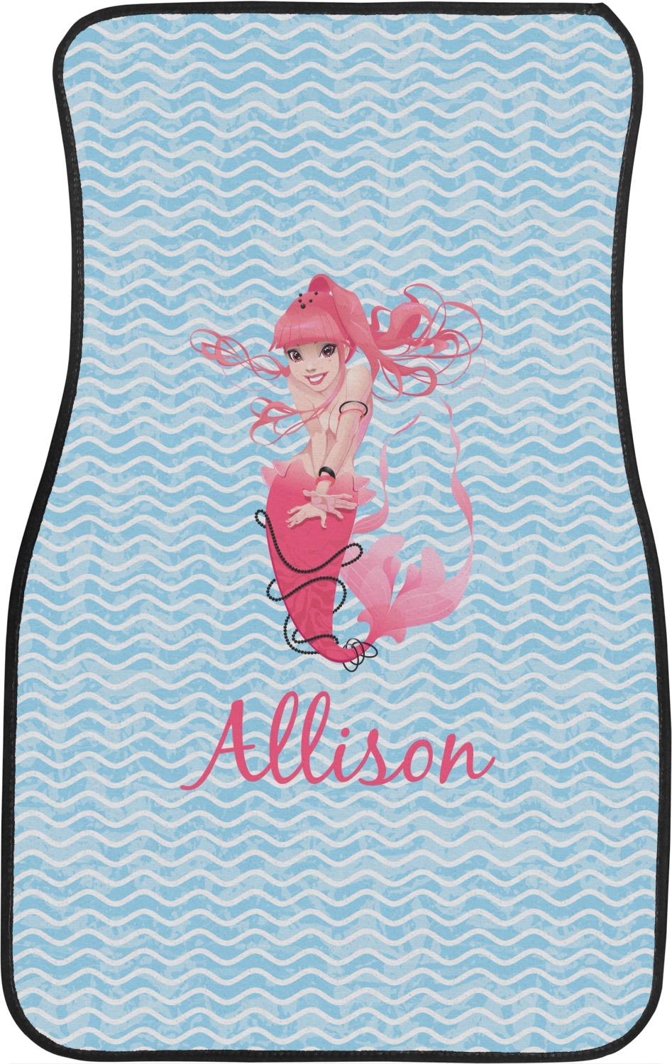 Start your deep sea adventure with this whimsical Mermaid design. Our design shows a playful mermaid with pink hair and tail with black beads on dynamic blue waves. We have other mermaids including some more suitable for younger girls in our system, so you can always change out the mermaid graphic.