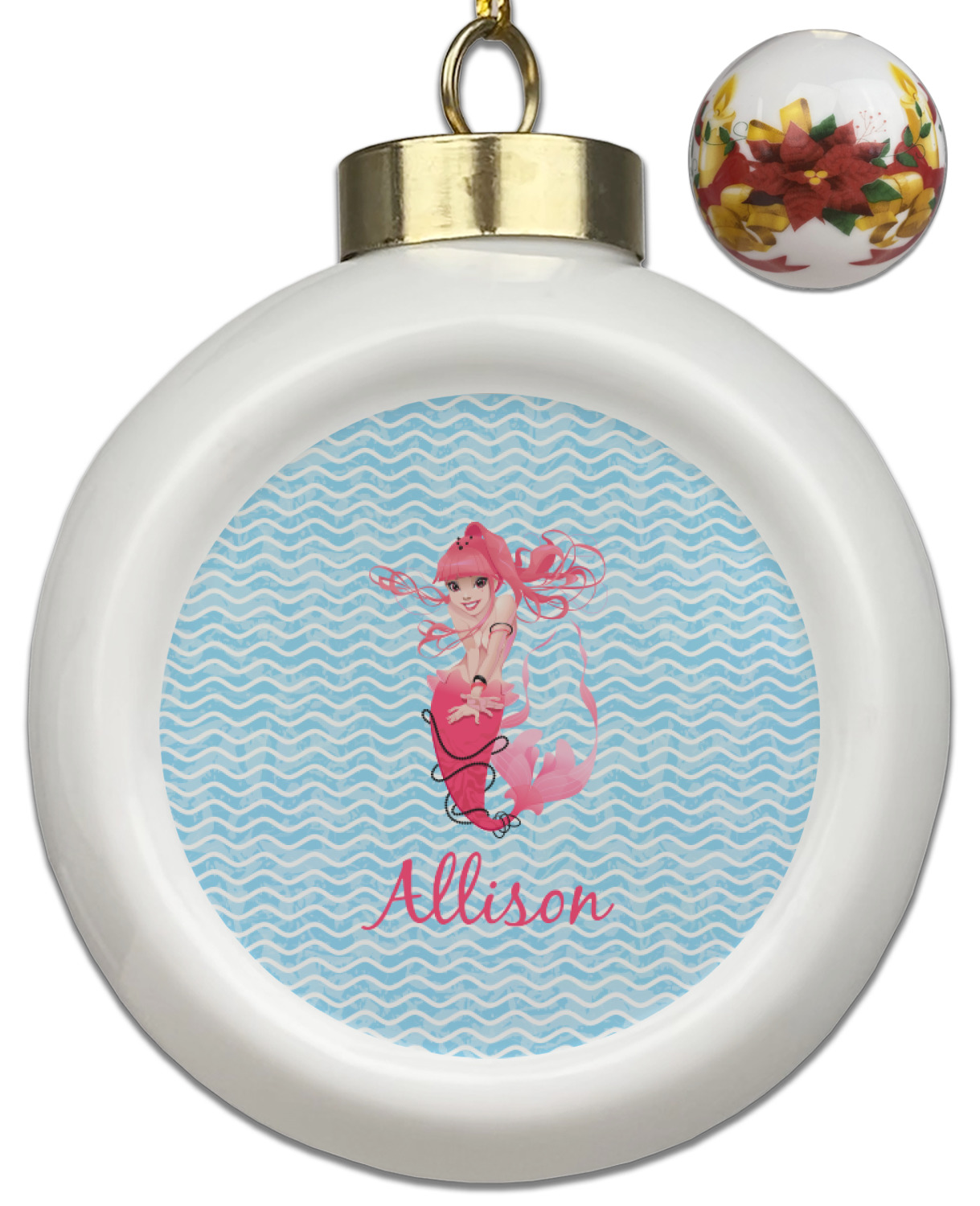 Our Christmas ornaments are a unique ceramic ball shape with a twist as it has a flat face to display your custom design! Select from one of our two design types - Christmas Tree or Poinsettia Garland - to adorn the curved back of your personal design. Each ornament measures 3H x 2.5W x 2D accompanied with a gold string accent for finishing touches to hang on your beautiful Christmas tree!