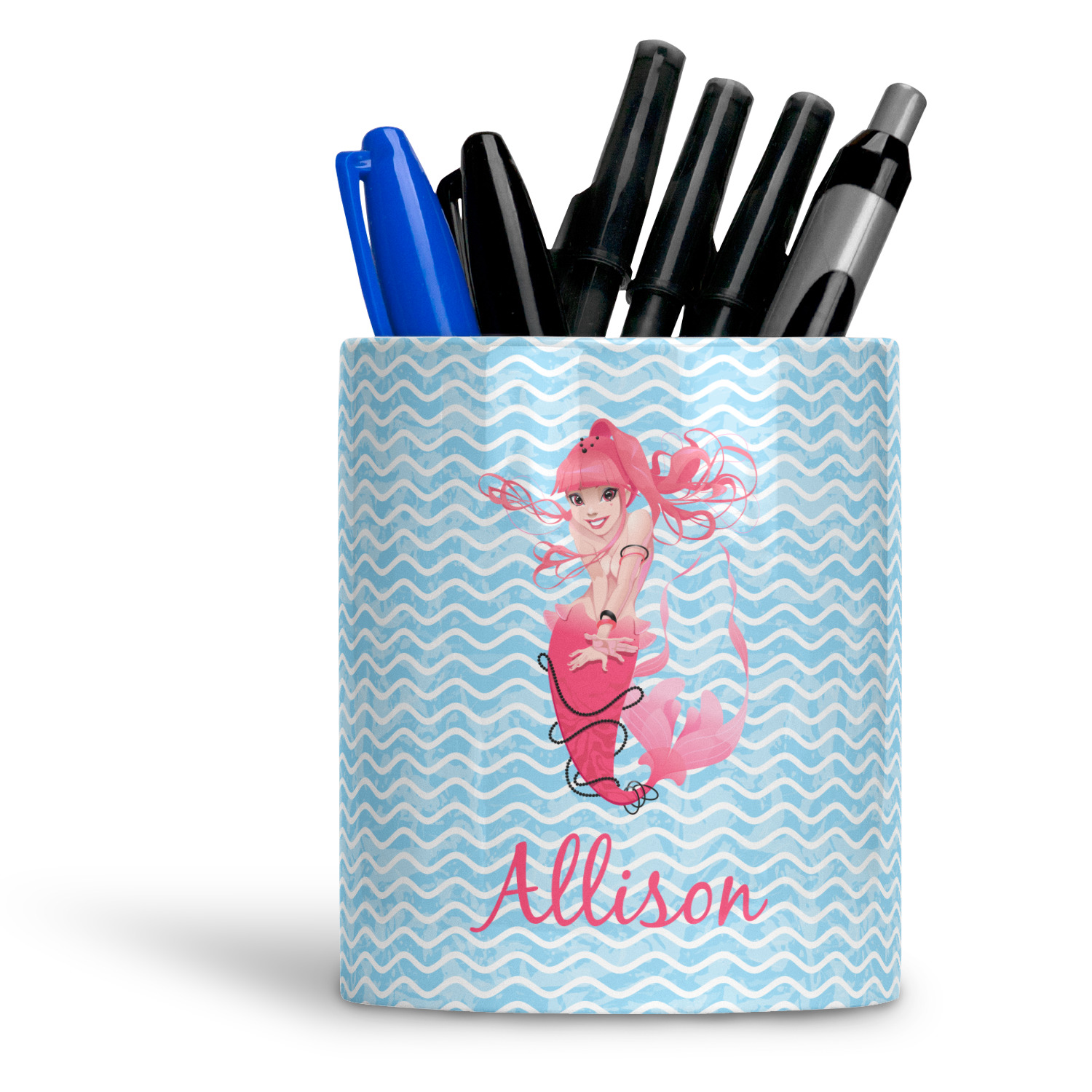 Made from white ceramic, this pen holder displays your personalized design across its surface. This pen organizer measures at 3.75" high by 3.25 inches diameter and has ample space for several pens, pencils, scissors, markers, and more! This is also a multipurpose accessory; you can use it to store makeup brushes, other utensils, and more!