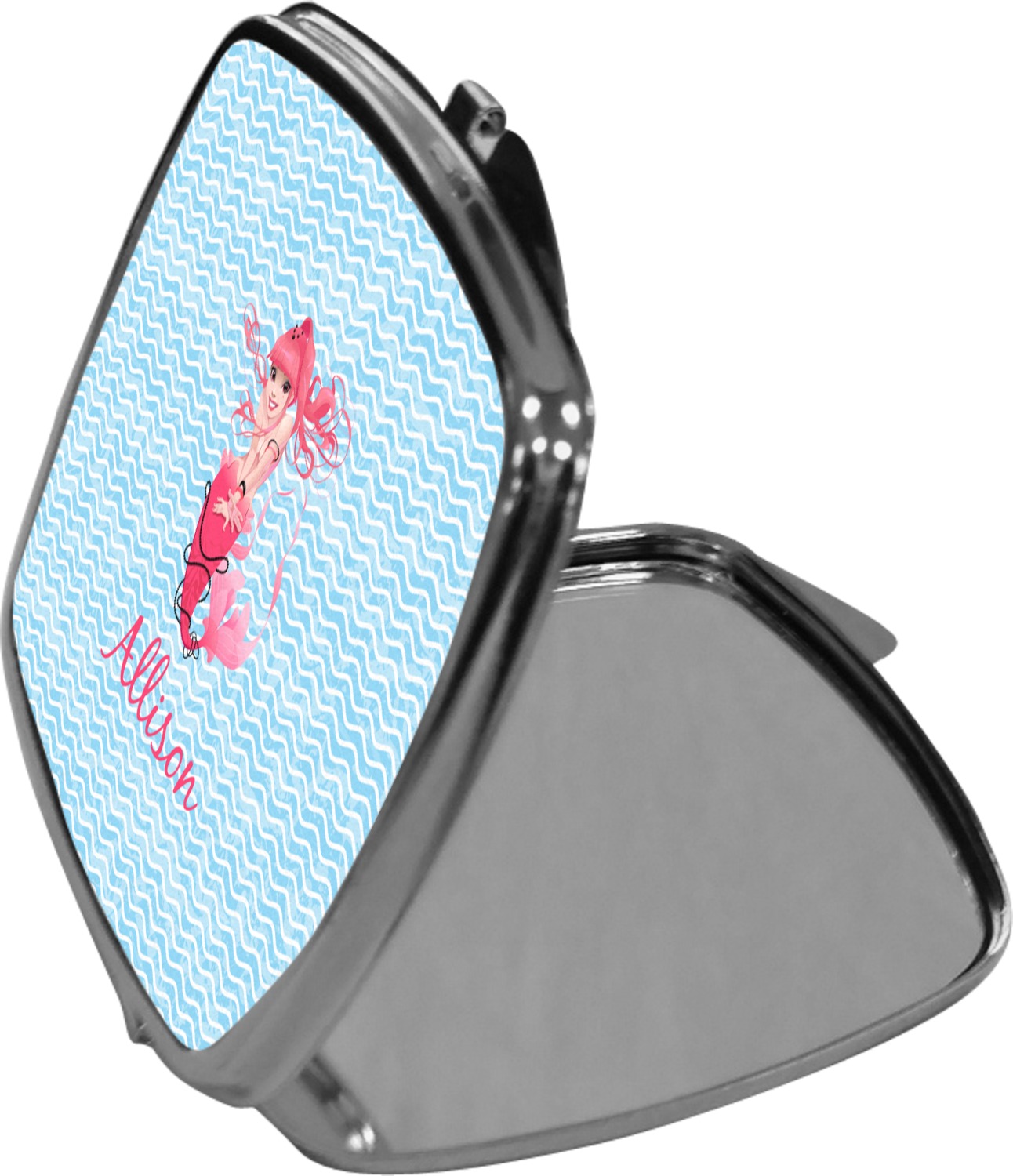 Our compact mirrors are customized with your design on one side. The other side is patterned silver tone metal. Inside, there are two mirrors.