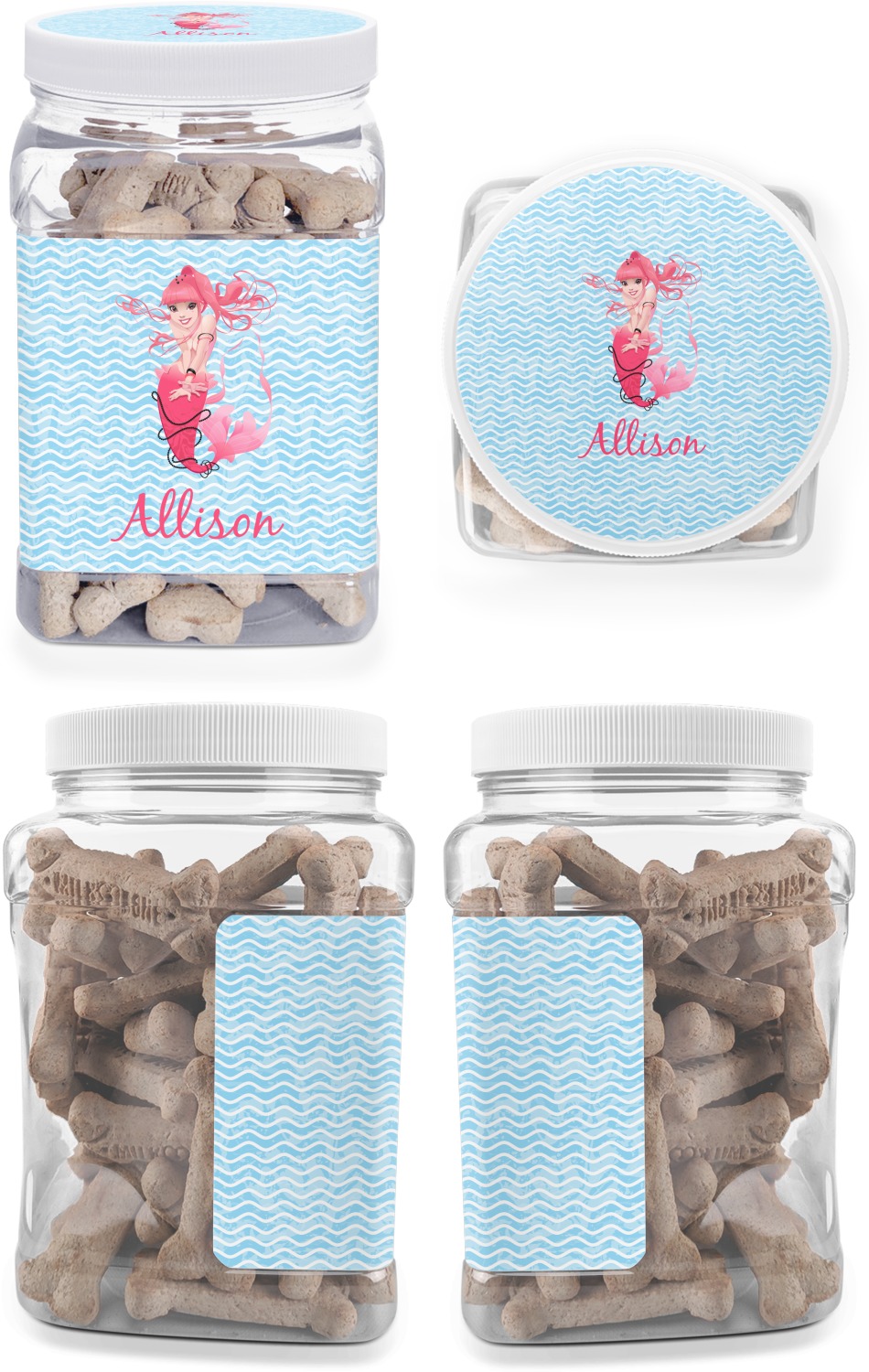 This half gallon jar, made from a sturdy plastic, is the perfect way to keep treats from any naughty pet paws, while still keeping them ready on hand for when your pup performs an impressive trick. This dog cookie jar features a screw-on, white lid that displays your personalized design on a vinyl sticker. We apply another customized sticker that wraps around the front and sides of the jar. Our dog treat jar also has indentations on the rear ends of the sides, which allows for convenient handling, and its square frame allows for easy storage.
