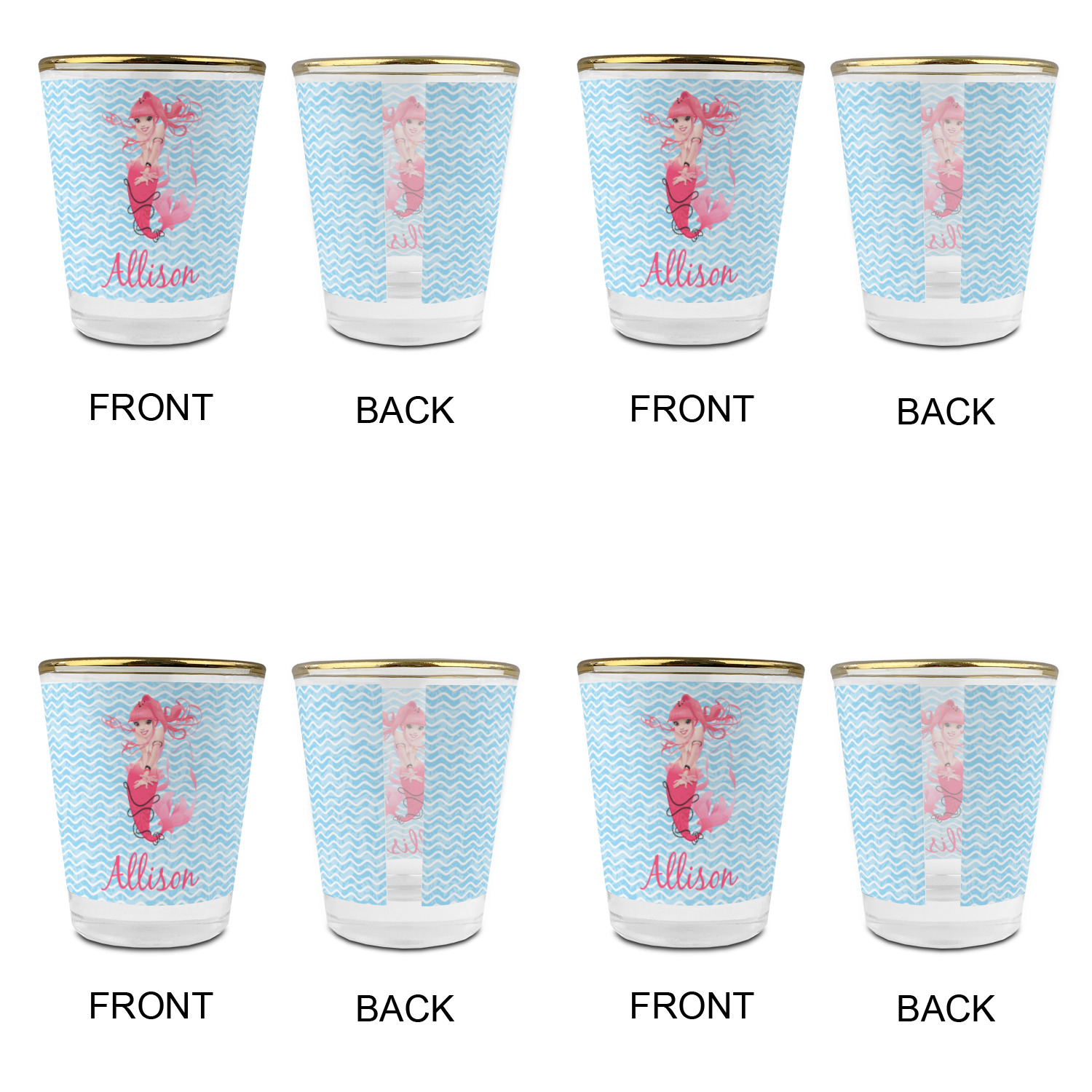 Made with frosted glass, these shot glasses are printed in full color with the design of your choice. They are a standard 1.5oz shot glass and are 2.4" tall. The print is wrapped around the shot glass in a full wrap and boldly displays your customization.