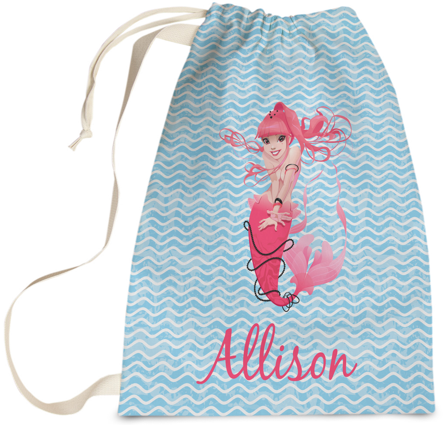 Carry your laundry in style with these customized laundry bags. Available in two sizes, featuring a natural colored woven strap and a cinch cord, these bags hold a lot of clothes or anything else you want to fit in them.