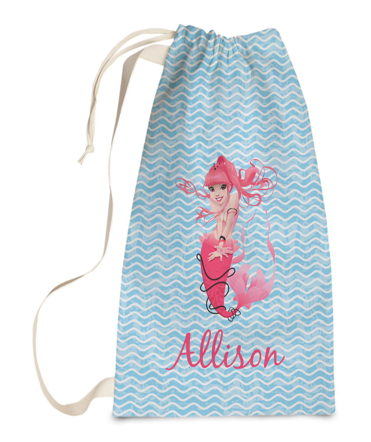 Carry your laundry in style with these customized laundry bags. Available in two sizes, featuring a natural colored woven strap and a cinch cord, these bags hold a lot of clothes or anything else you want to fit in them.