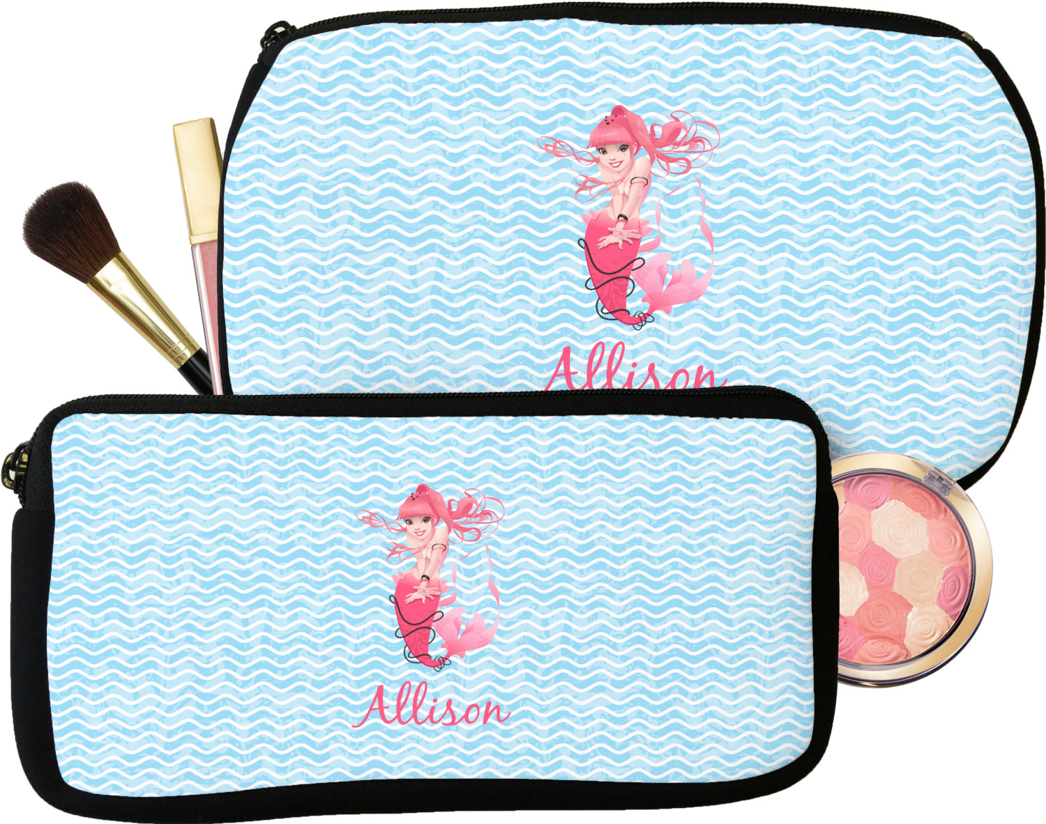 Our personalized makeup bags are available in many different designs, patterns and colors - so you are sure to find one that will love. They are made of neoprene (same material as wet-suits) and thus are water resistant, so spillages in your makeup bag will not end up all over you purse. They are customized on one side and are black on the other side and the zipper is black as well.