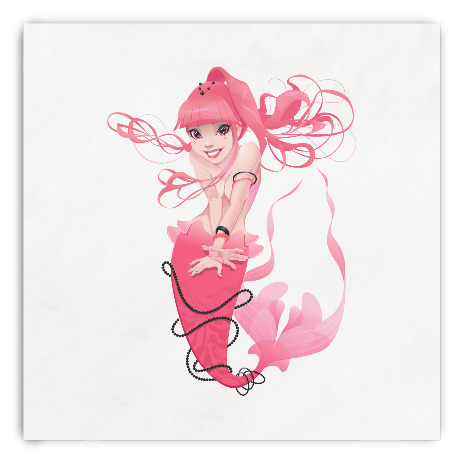 Start your deep sea adventure with this whimsical Mermaid design. Our design shows a playful mermaid with pink hair and tail with black beads on dynamic blue waves. We have other mermaids including some more suitable for younger girls in our system, so you can always change out the mermaid graphic.