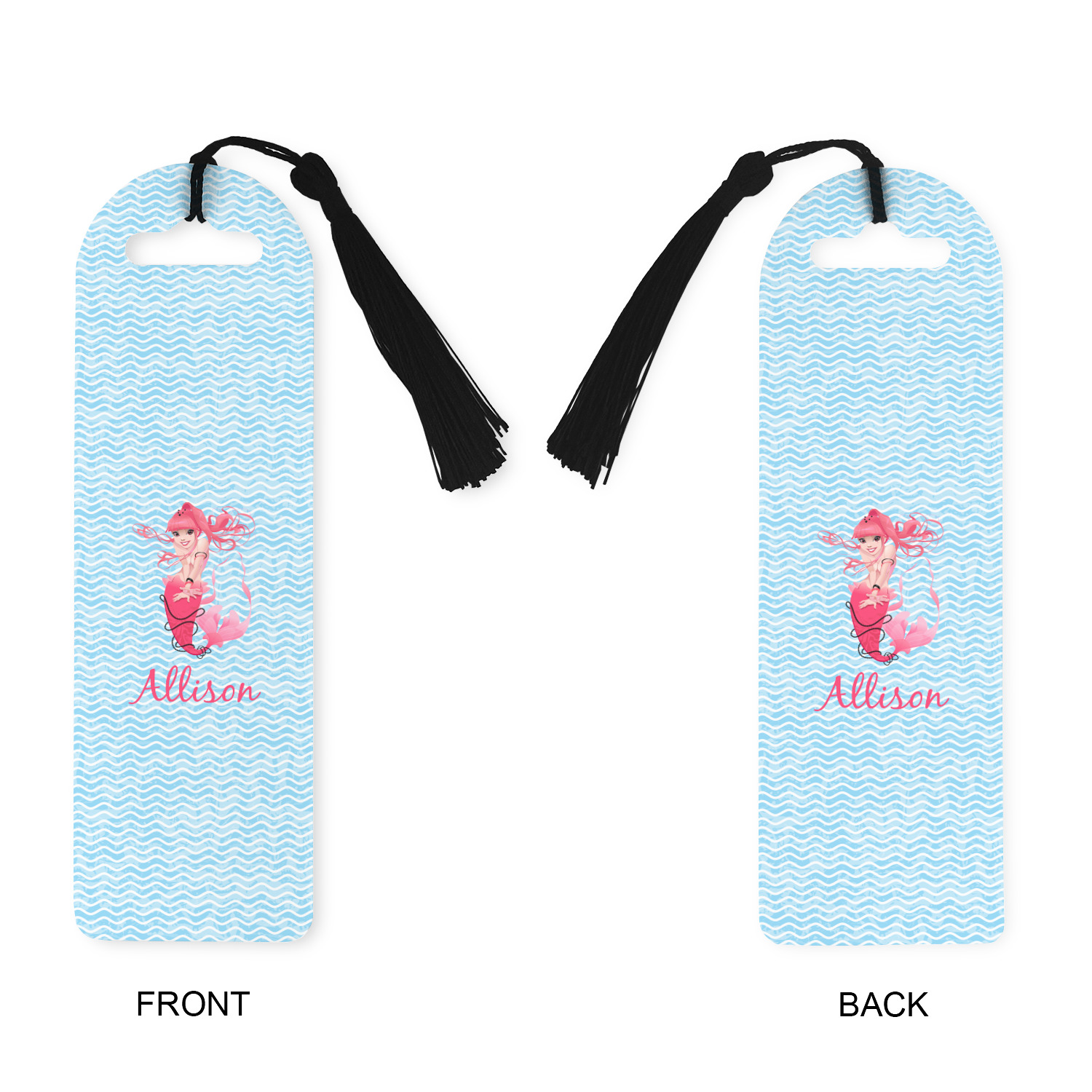 Made from a durable, flexible plastic, these bookmarks are printed with your custom design on them. With the tassel on them they make it easy to find your page in your book. These are a rectangular shape 7 1/4 inches tall with a rounded top and are approximately 2 1/4 inches wide.