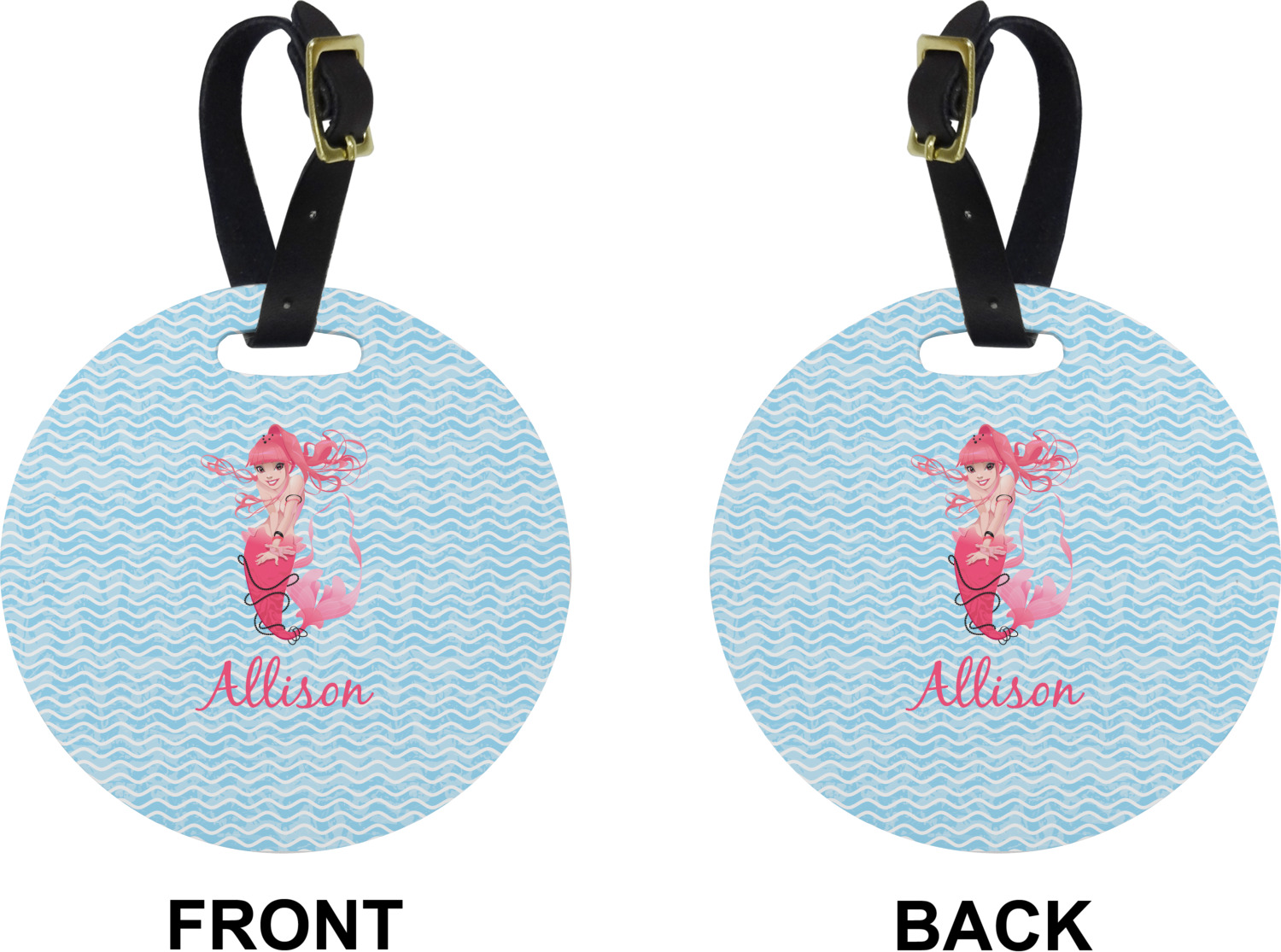 These personalized bag tags are sold in a variety of shapes, so that you may find the product that meets your vision exactly. We sell a round luggage tag, which measures at approximately 4" x 4". Our square luggage tag is about 3.5" x 3.5", while our rectangular version is 2.75" x 4 ".