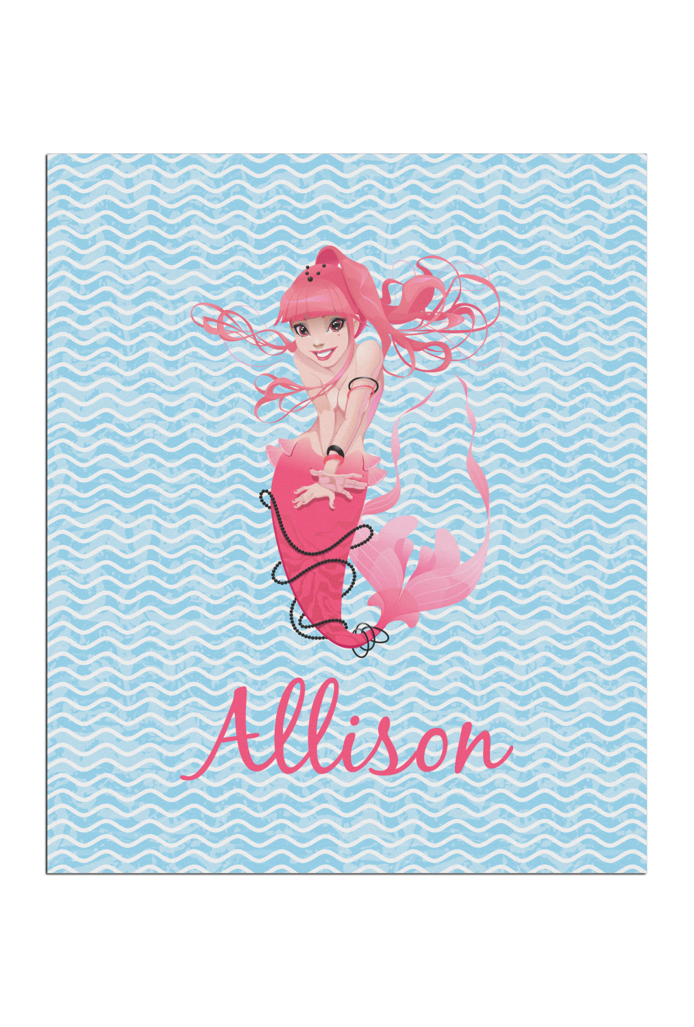 Start your deep sea adventure with this whimsical Mermaid design. Our design shows a playful mermaid with pink hair and tail with black beads on dynamic blue waves. We have other mermaids including some more suitable for younger girls in our system, so you can always change out the mermaid graphic.