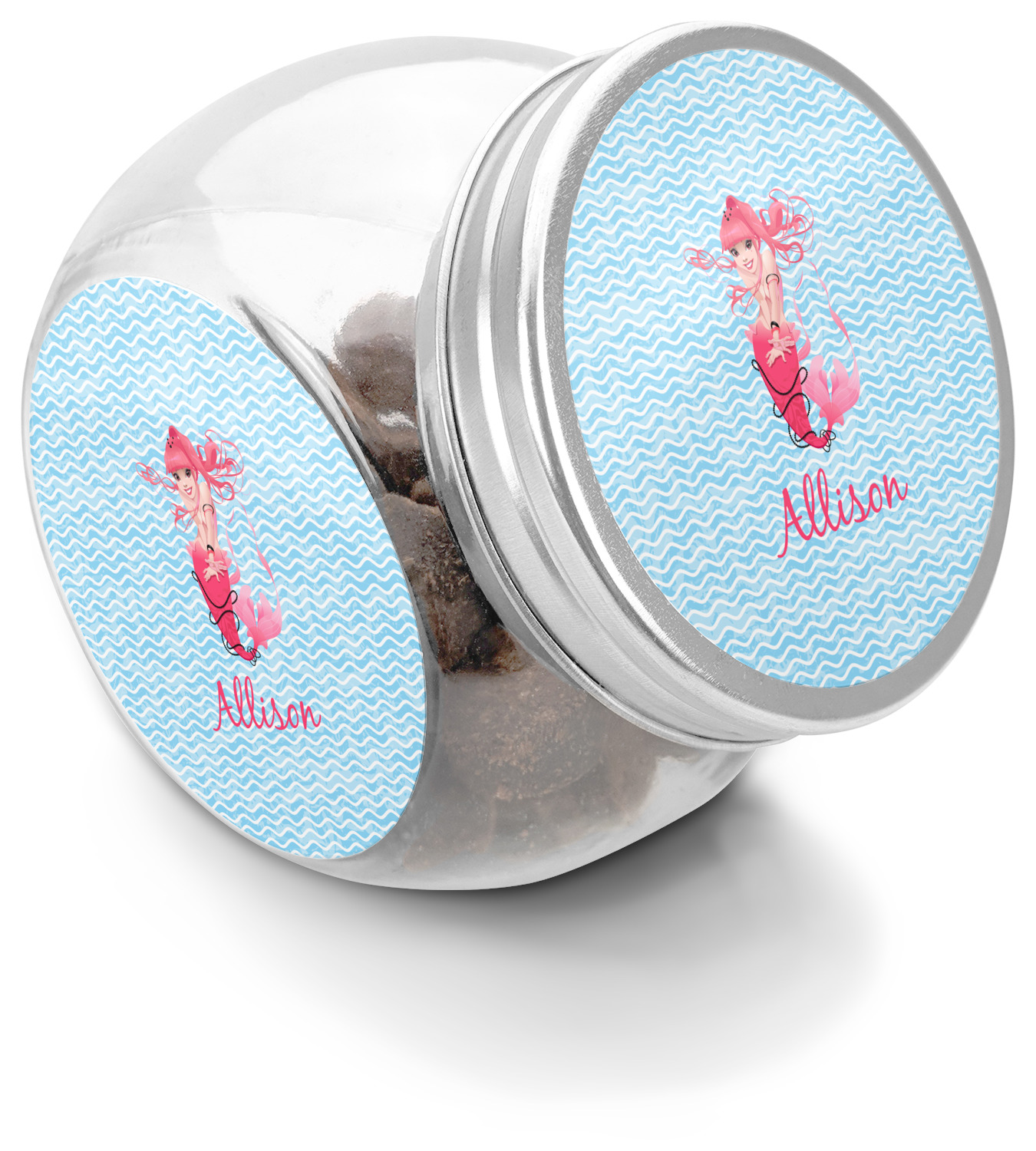 This treat jar is an excellent way to store treats for your favorite canine or feline. Moreover, their delicate, classy appearance makes them a tasteful addition to your countertop's décor. Crafted from clear glass, its unique construction and silver metal, screw-on lid allows for quick and easy access. Three, permanent, vinyl stickers are applied to both sides of the jar and lid, presenting your personalized design. The base of this glass, dog treat jar is 3.4" x 4.75", and the jar stands at 5" tall. Though on the smaller side, this jar is best suited for smaller treats or training treats.