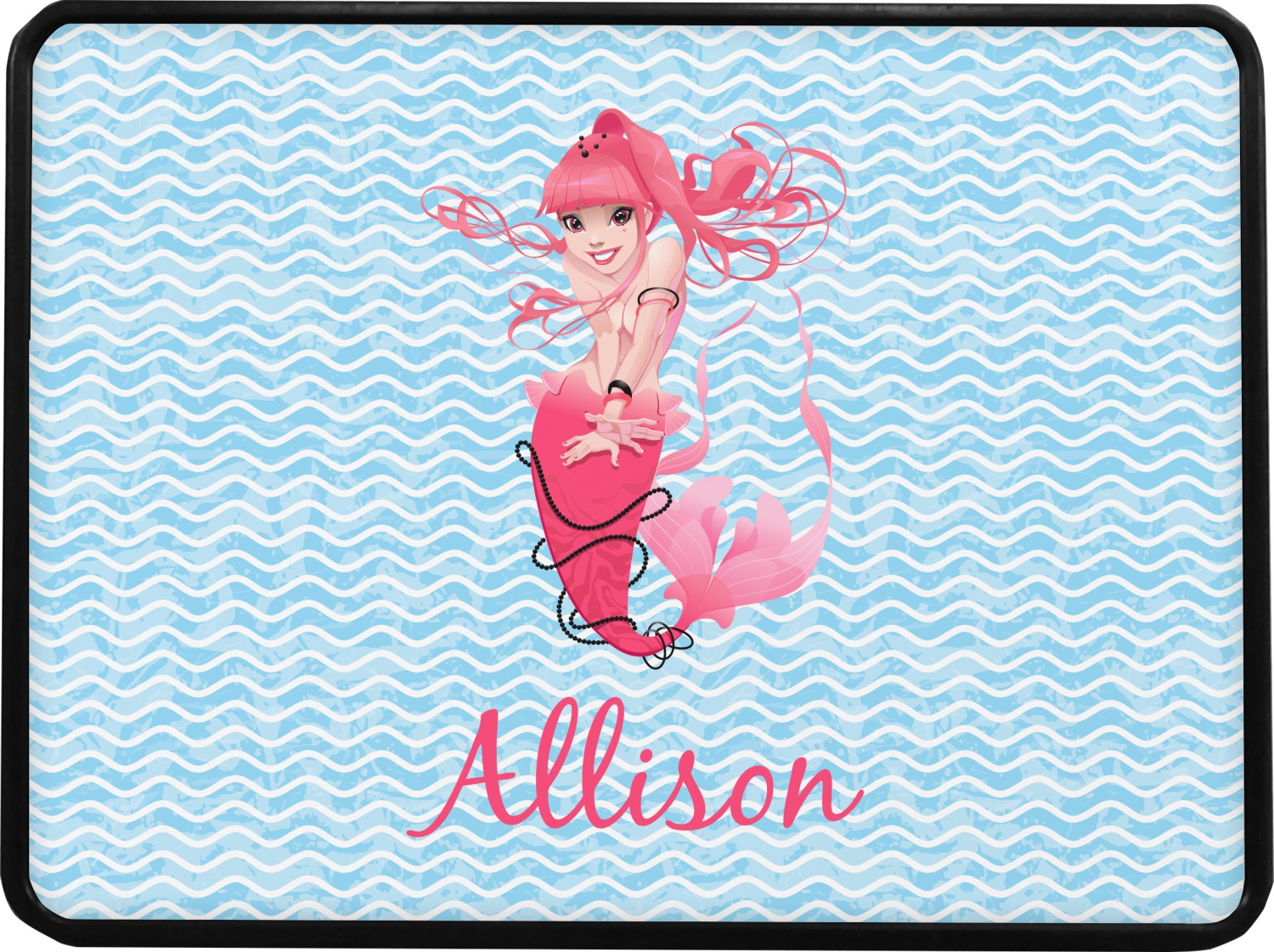 Start your deep sea adventure with this whimsical Mermaid design. Our design shows a playful mermaid with pink hair and tail with black beads on dynamic blue waves. We have other mermaids including some more suitable for younger girls in our system, so you can always change out the mermaid graphic.