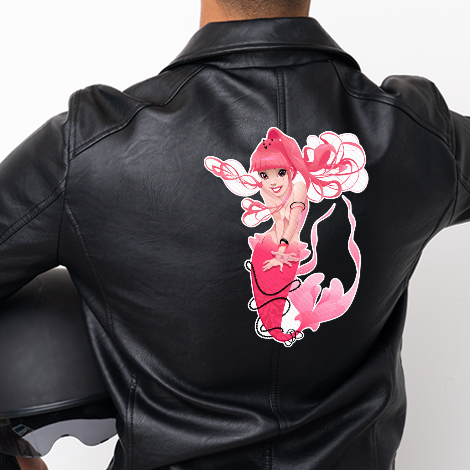 Start your deep sea adventure with this whimsical Mermaid design. Our design shows a playful mermaid with pink hair and tail with black beads on dynamic blue waves. We have other mermaids including some more suitable for younger girls in our system, so you can always change out the mermaid graphic.