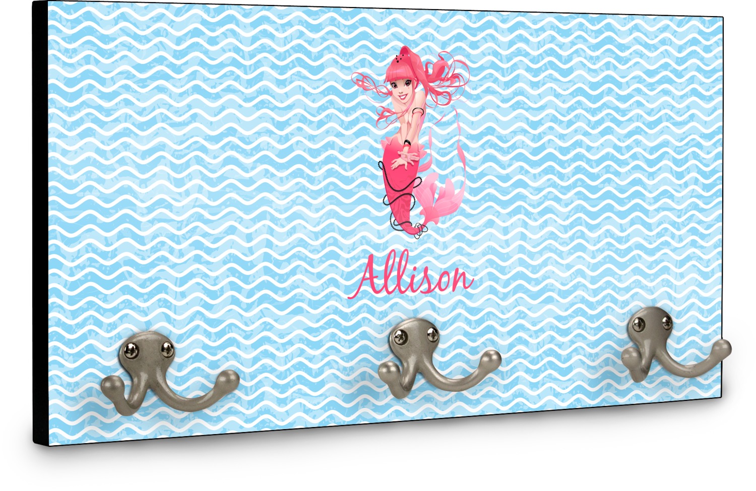This coat rack is the perfect way to add some personality to your wall or entryway. The board is made of a strong maple that is approximately 16" x 8". The three 2-prong hooks are a sturdy metal that have three screws attaching them to the board. Your design is printed right onto the front of the board while the back and sides are a simple black.