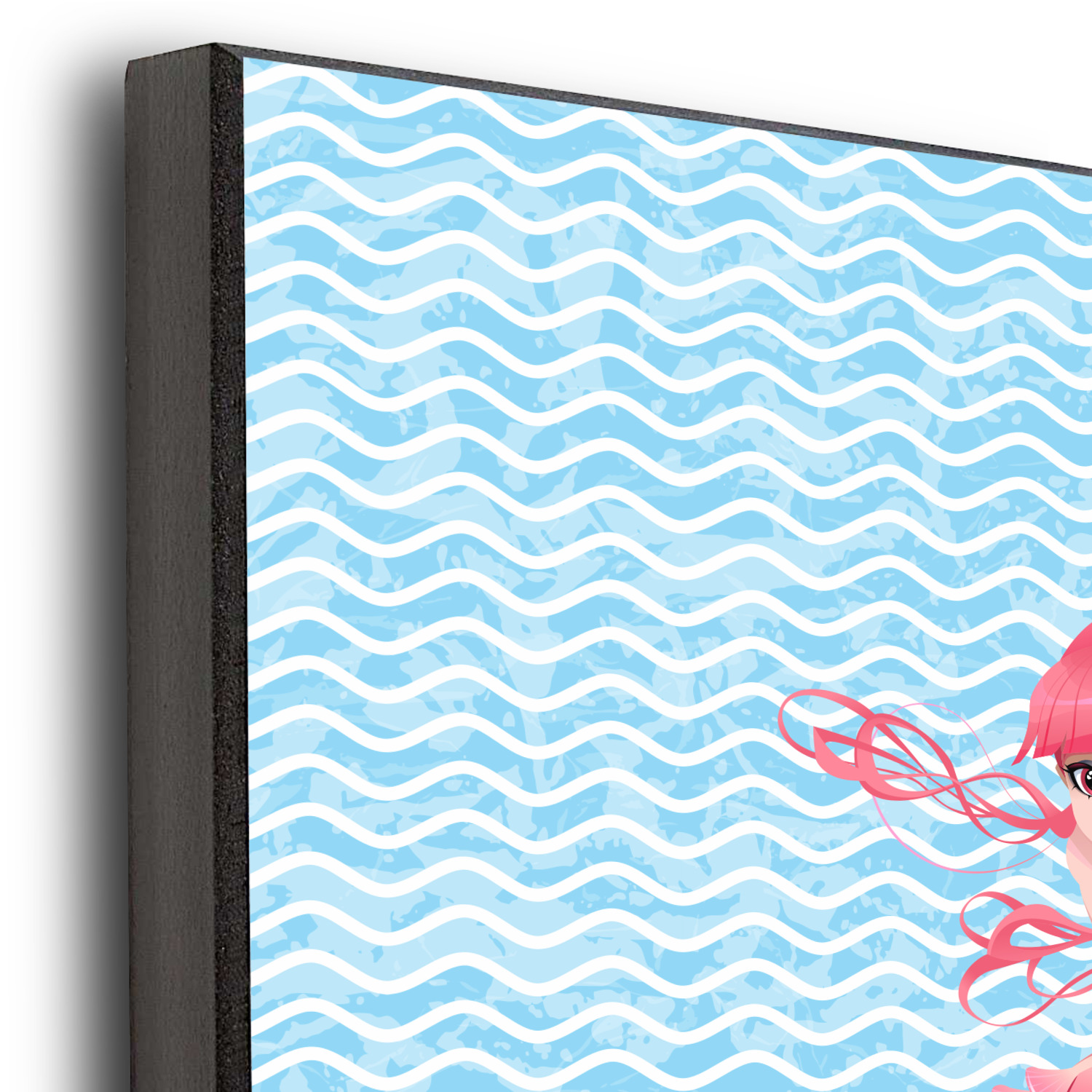Start your deep sea adventure with this whimsical Mermaid design. Our design shows a playful mermaid with pink hair and tail with black beads on dynamic blue waves. We have other mermaids including some more suitable for younger girls in our system, so you can always change out the mermaid graphic.