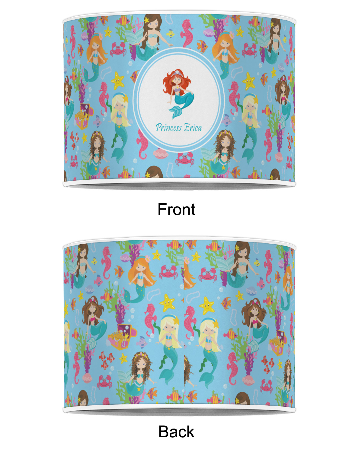 Love mermaids? This customize-able design has mermaids, sea creatures such as seahorses, fish, crabs, seahorses, oysters, seaweed and of course a treasure chest. We chose a soft blue to represent water for the background. You can change this to any color you desire. We have featured a mermaid in a round label, along with personalization under the mermaid graphic.