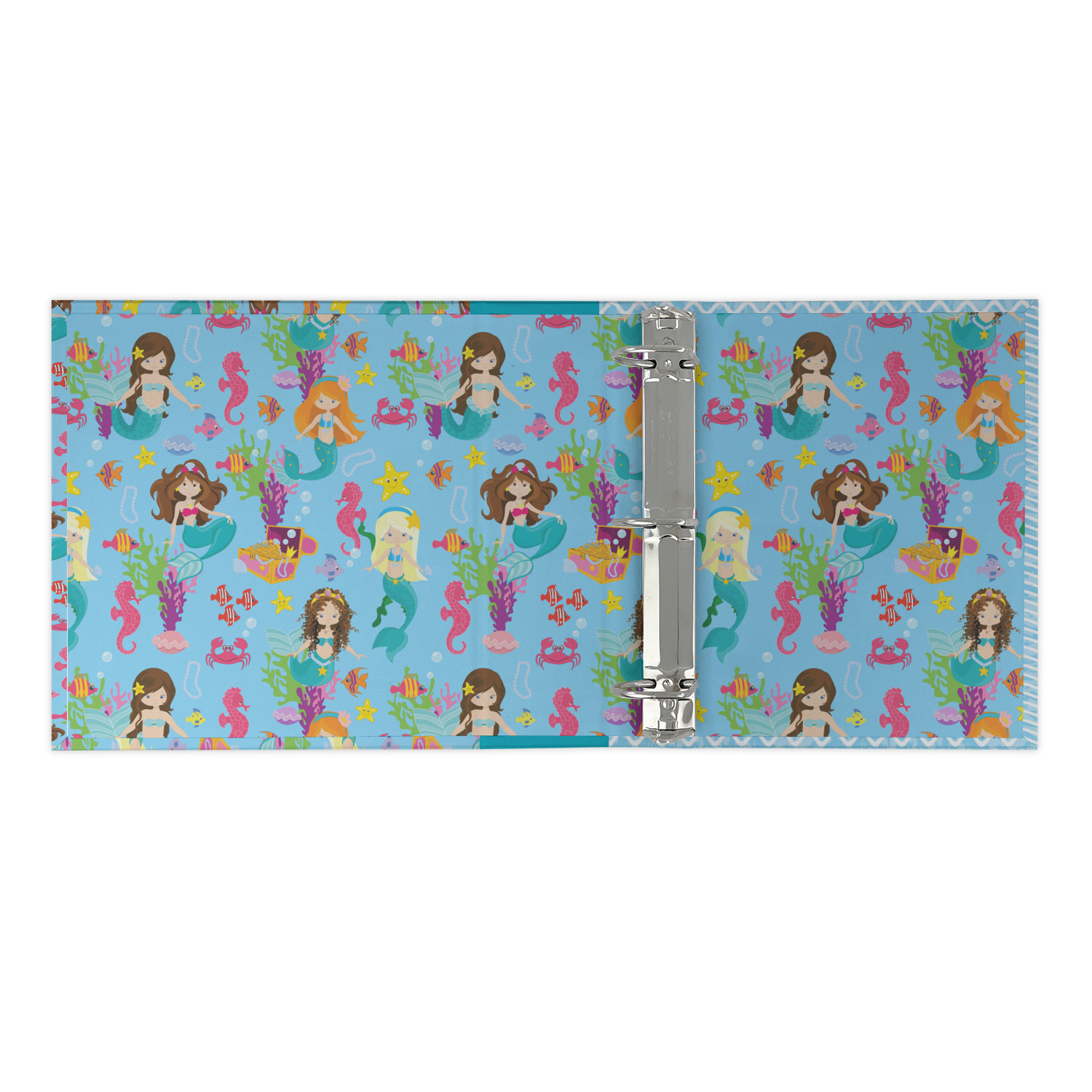 Love mermaids? This customize-able design has mermaids, sea creatures such as seahorses, fish, crabs, seahorses, oysters, seaweed and of course a treasure chest. We chose a soft blue to represent water for the background. You can change this to any color you desire. We have featured a mermaid in a round label, along with personalization under the mermaid graphic.