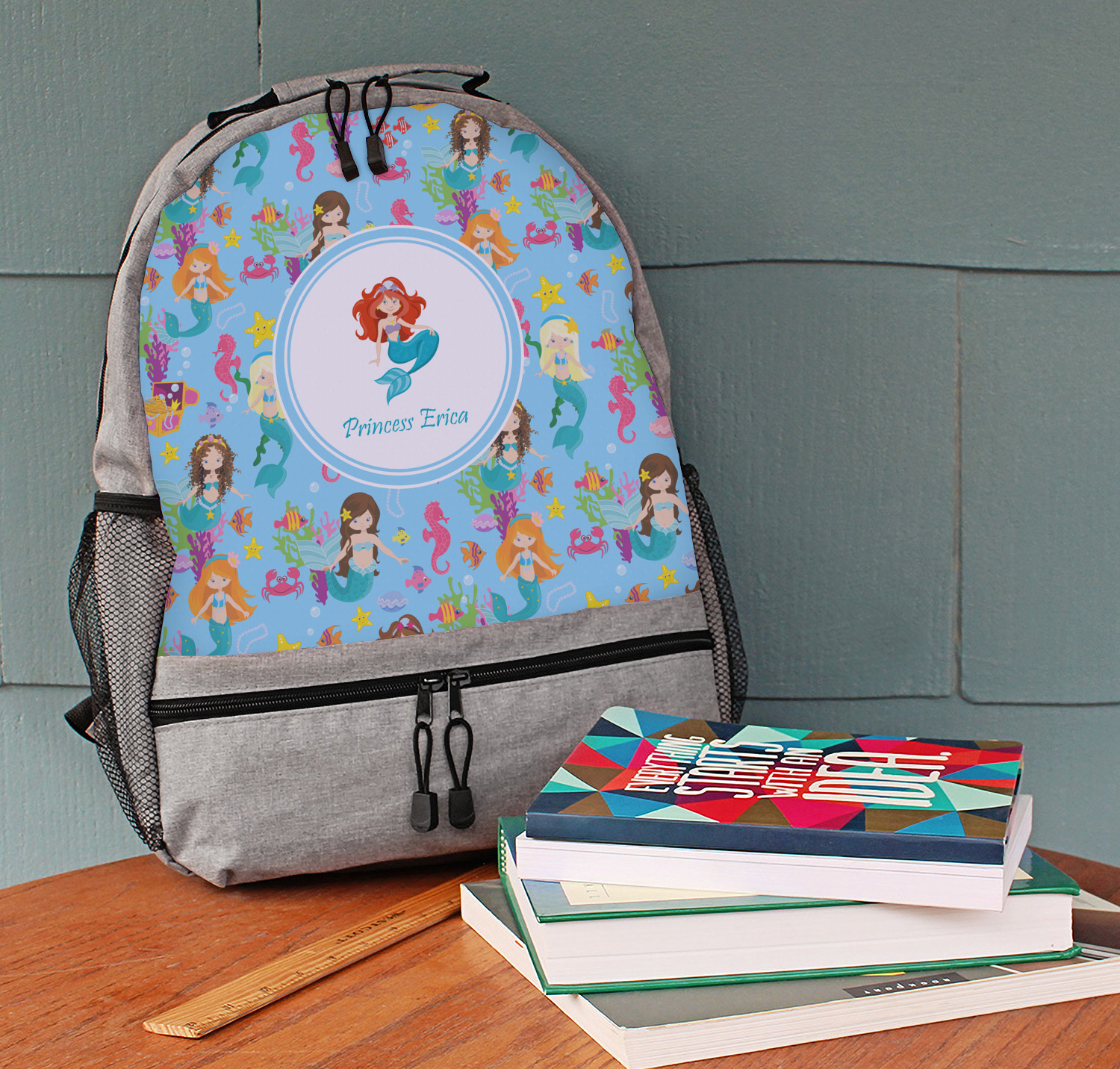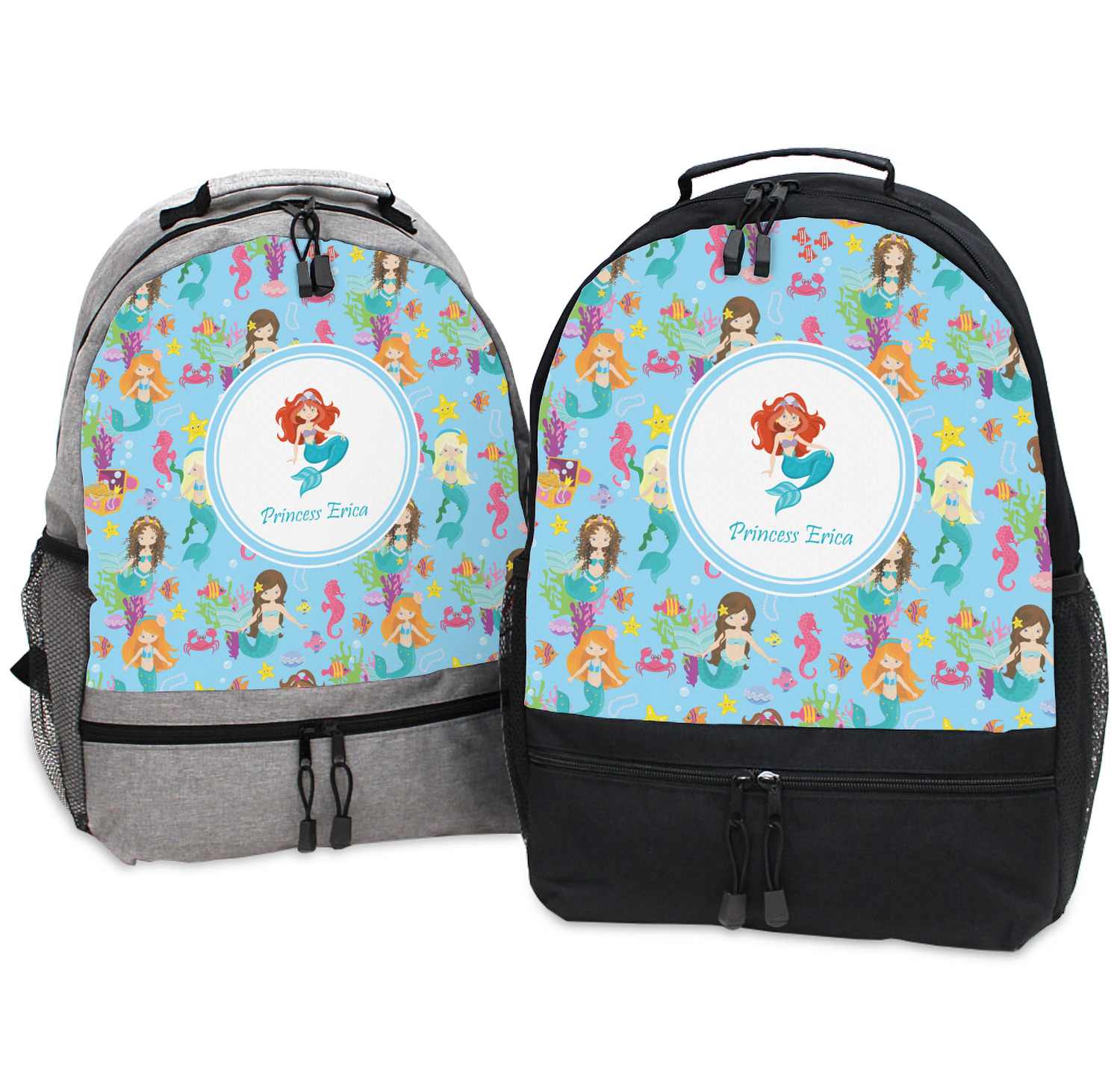 Love mermaids? This customize-able design has mermaids, sea creatures such as seahorses, fish, crabs, seahorses, oysters, seaweed and of course a treasure chest. We chose a soft blue to represent water for the background. You can change this to any color you desire. We have featured a mermaid in a round label, along with personalization under the mermaid graphic.