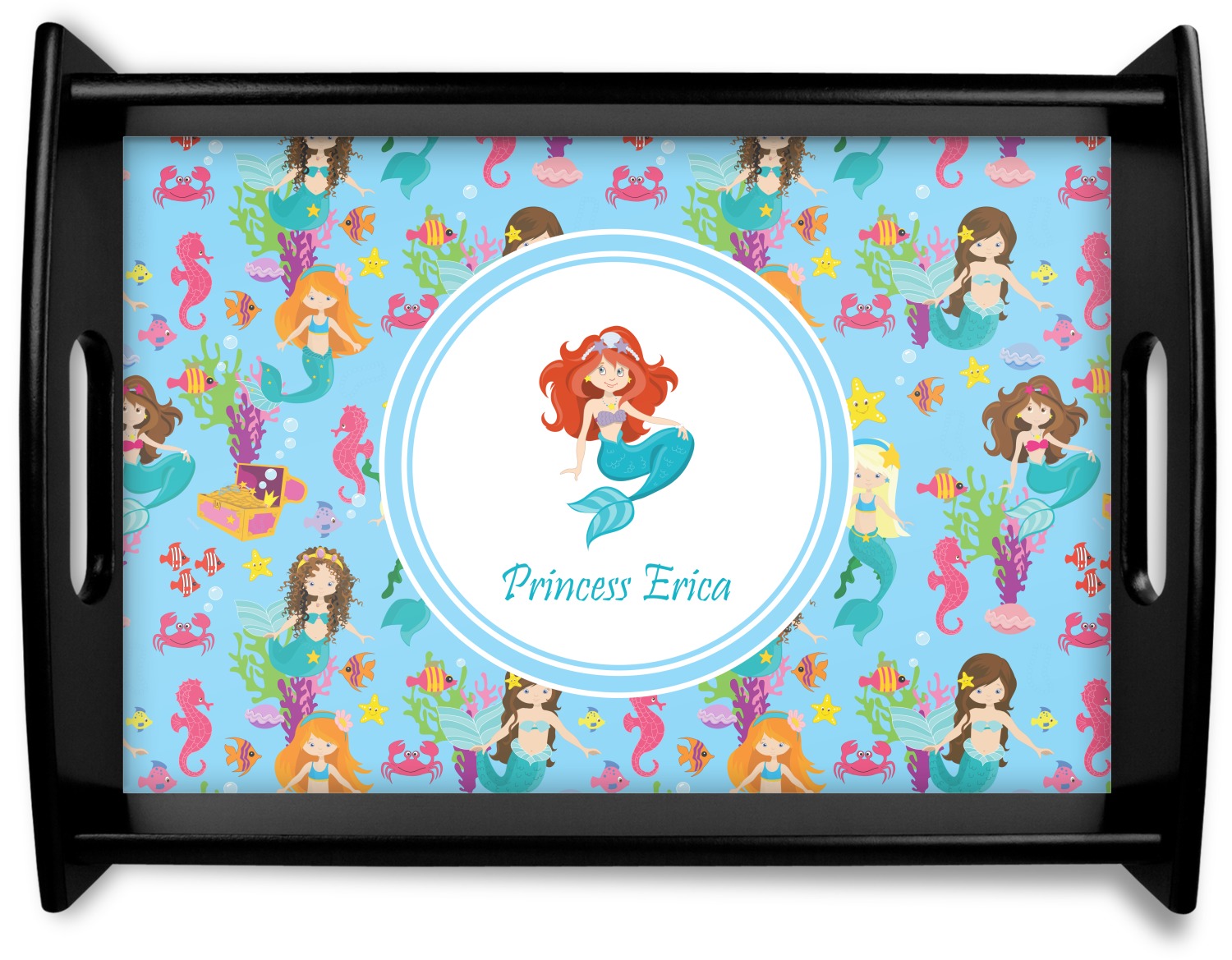 Love mermaids? This customize-able design has mermaids, sea creatures such as seahorses, fish, crabs, seahorses, oysters, seaweed and of course a treasure chest. We chose a soft blue to represent water for the background. You can change this to any color you desire. We have featured a mermaid in a round label, along with personalization under the mermaid graphic.