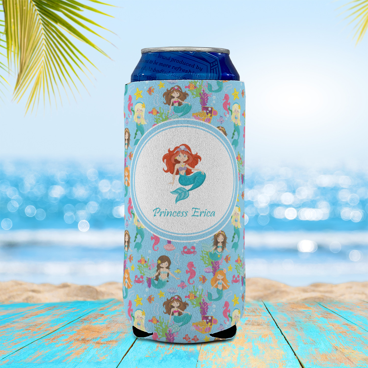 Love mermaids? This customize-able design has mermaids, sea creatures such as seahorses, fish, crabs, seahorses, oysters, seaweed and of course a treasure chest. We chose a soft blue to represent water for the background. You can change this to any color you desire. We have featured a mermaid in a round label, along with personalization under the mermaid graphic.
