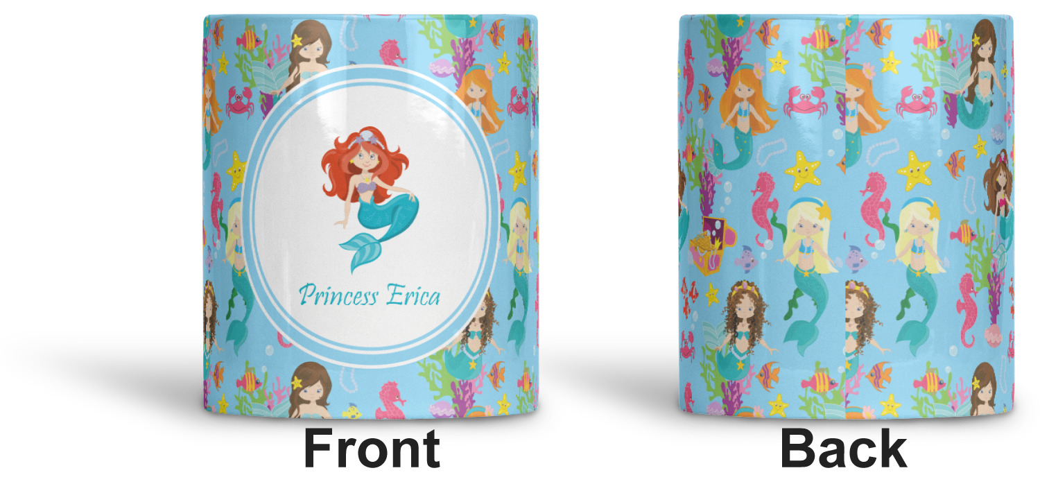 Love mermaids? This customize-able design has mermaids, sea creatures such as seahorses, fish, crabs, seahorses, oysters, seaweed and of course a treasure chest. We chose a soft blue to represent water for the background. You can change this to any color you desire. We have featured a mermaid in a round label, along with personalization under the mermaid graphic.