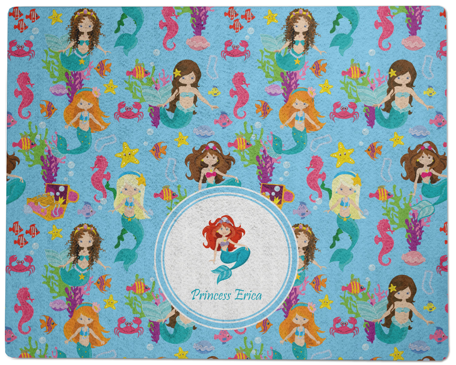 Love mermaids? This customize-able design has mermaids, sea creatures such as seahorses, fish, crabs, seahorses, oysters, seaweed and of course a treasure chest. We chose a soft blue to represent water for the background. You can change this to any color you desire. We have featured a mermaid in a round label, along with personalization under the mermaid graphic.