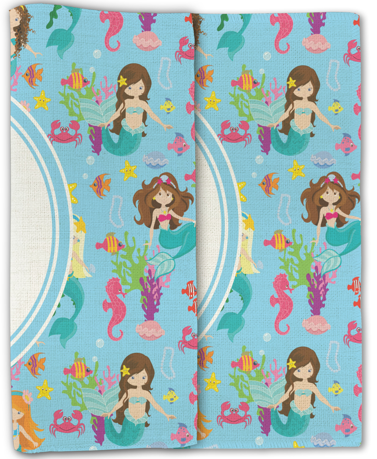 Love mermaids? This customize-able design has mermaids, sea creatures such as seahorses, fish, crabs, seahorses, oysters, seaweed and of course a treasure chest. We chose a soft blue to represent water for the background. You can change this to any color you desire. We have featured a mermaid in a round label, along with personalization under the mermaid graphic.
