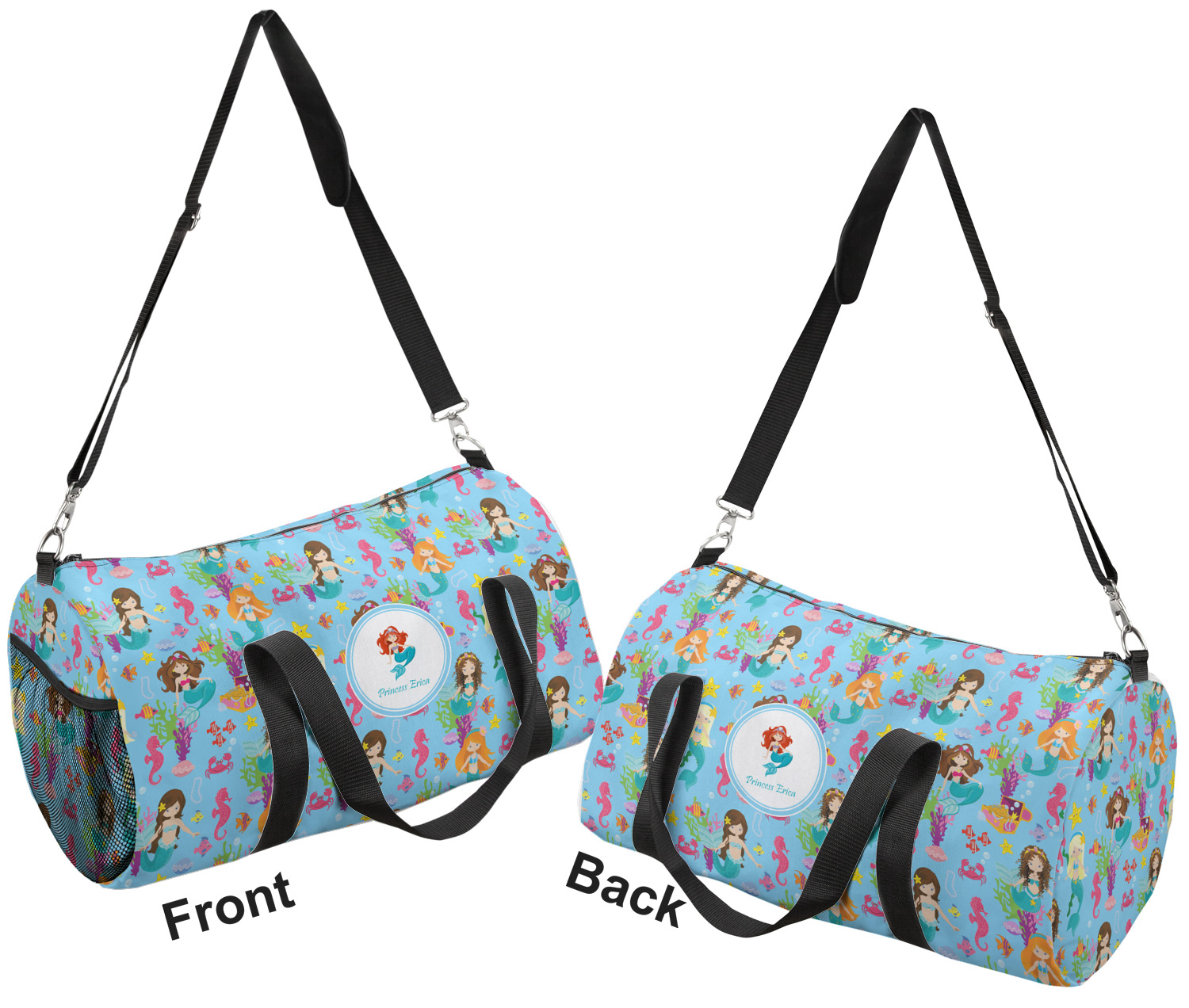 Love mermaids? This customize-able design has mermaids, sea creatures such as seahorses, fish, crabs, seahorses, oysters, seaweed and of course a treasure chest. We chose a soft blue to represent water for the background. You can change this to any color you desire. We have featured a mermaid in a round label, along with personalization under the mermaid graphic.
