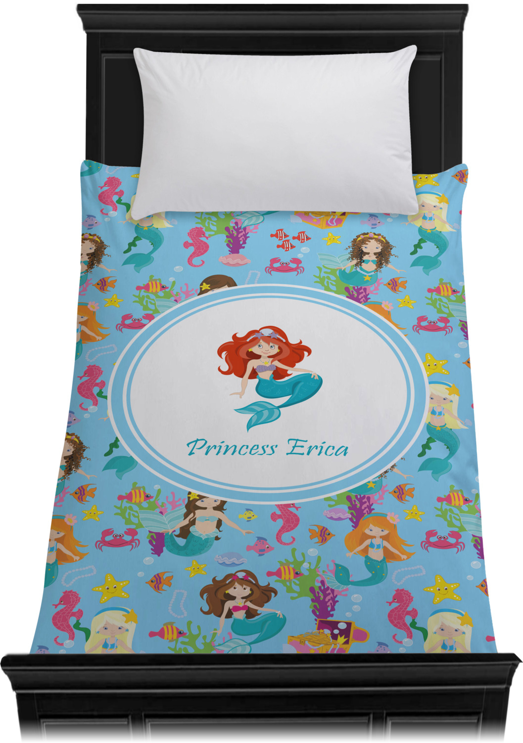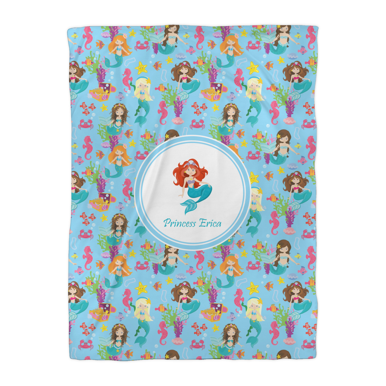 Love mermaids? This customize-able design has mermaids, sea creatures such as seahorses, fish, crabs, seahorses, oysters, seaweed and of course a treasure chest. We chose a soft blue to represent water for the background. You can change this to any color you desire. We have featured a mermaid in a round label, along with personalization under the mermaid graphic.