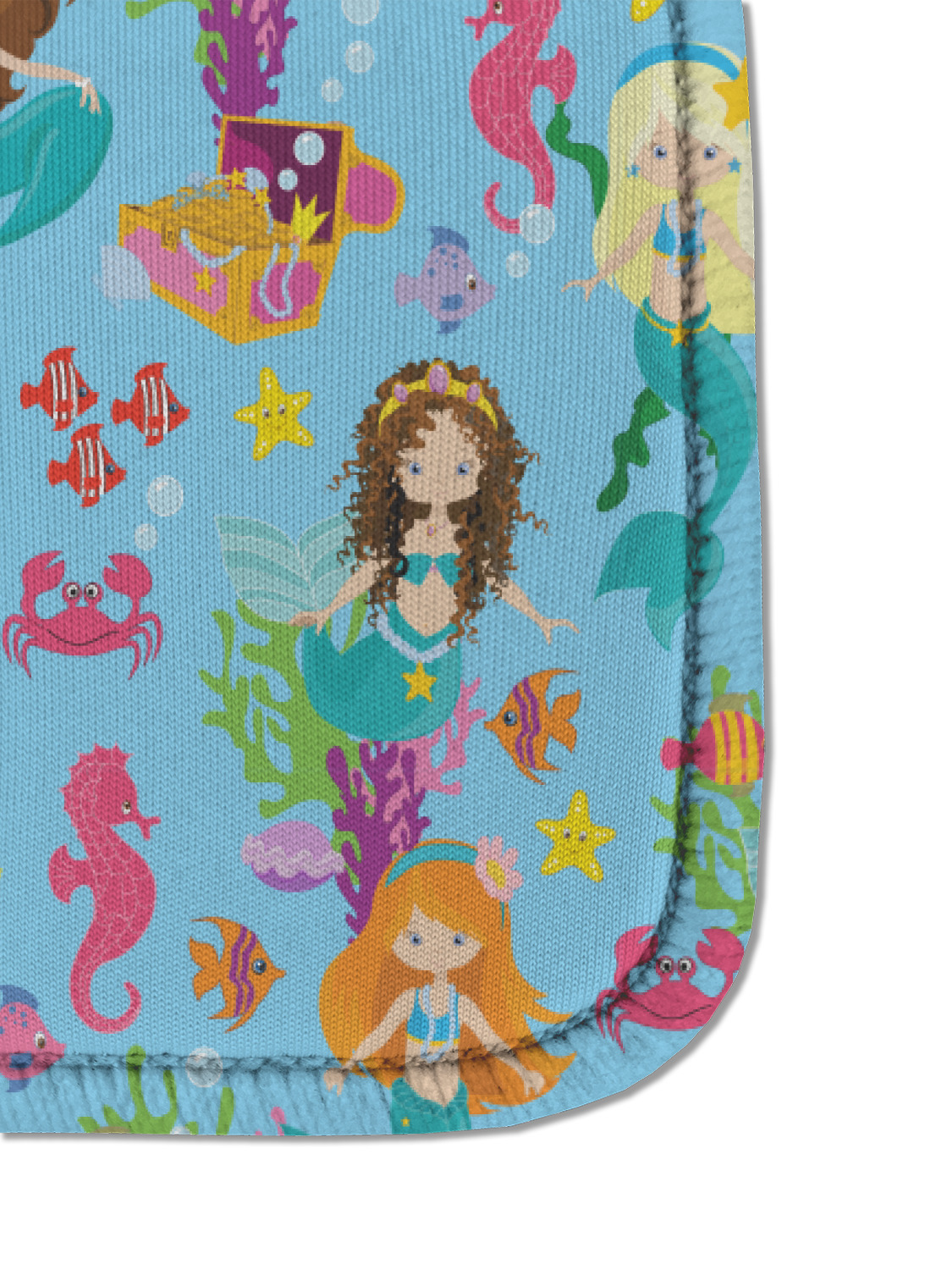 Love mermaids? This customize-able design has mermaids, sea creatures such as seahorses, fish, crabs, seahorses, oysters, seaweed and of course a treasure chest. We chose a soft blue to represent water for the background. You can change this to any color you desire. We have featured a mermaid in a round label, along with personalization under the mermaid graphic.
