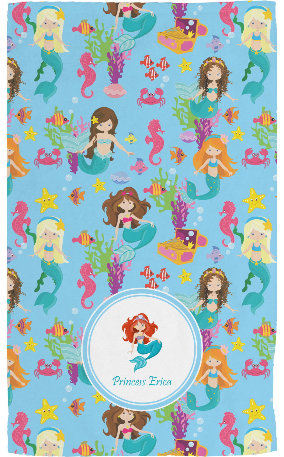 Love mermaids? This customize-able design has mermaids, sea creatures such as seahorses, fish, crabs, seahorses, oysters, seaweed and of course a treasure chest. We chose a soft blue to represent water for the background. You can change this to any color you desire. We have featured a mermaid in a round label, along with personalization under the mermaid graphic.