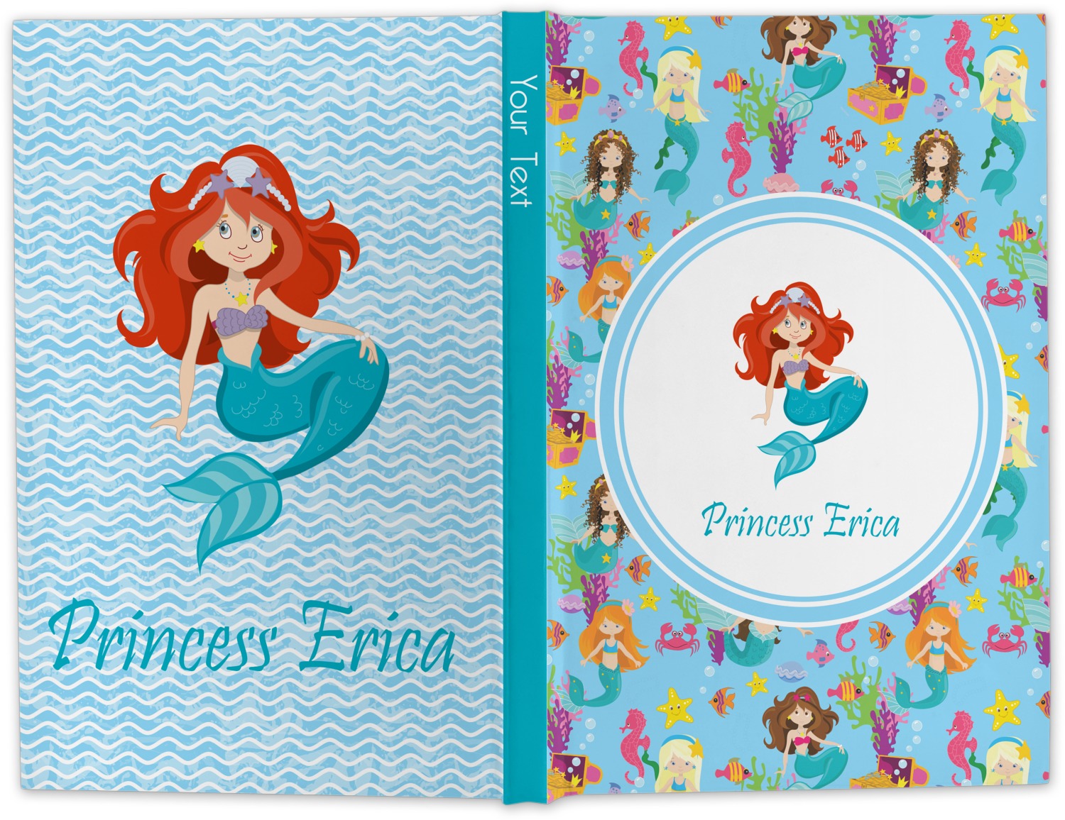 Love mermaids? This customize-able design has mermaids, sea creatures such as seahorses, fish, crabs, seahorses, oysters, seaweed and of course a treasure chest. We chose a soft blue to represent water for the background. You can change this to any color you desire. We have featured a mermaid in a round label, along with personalization under the mermaid graphic.