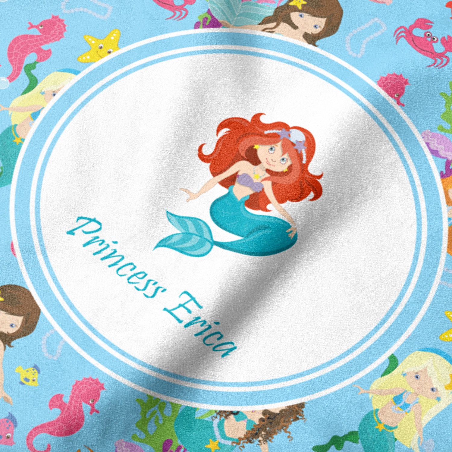 Love mermaids? This customize-able design has mermaids, sea creatures such as seahorses, fish, crabs, seahorses, oysters, seaweed and of course a treasure chest. We chose a soft blue to represent water for the background. You can change this to any color you desire. We have featured a mermaid in a round label, along with personalization under the mermaid graphic.
