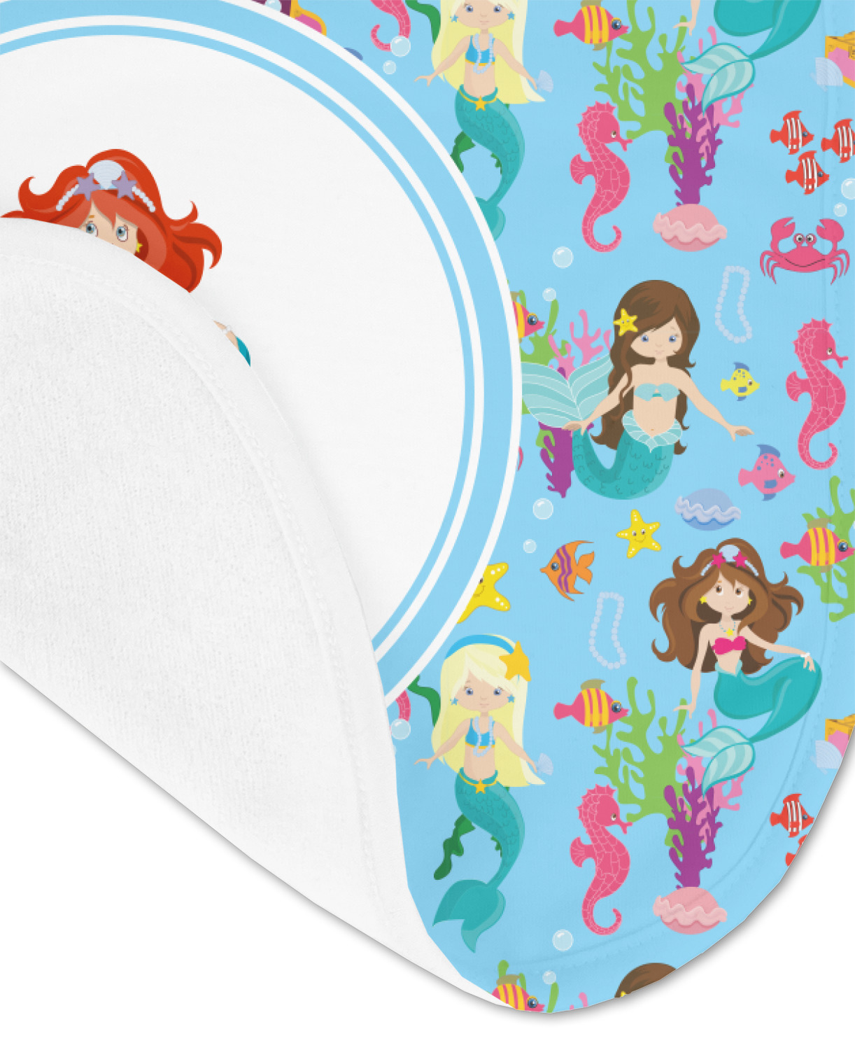 Love mermaids? This customize-able design has mermaids, sea creatures such as seahorses, fish, crabs, seahorses, oysters, seaweed and of course a treasure chest. We chose a soft blue to represent water for the background. You can change this to any color you desire. We have featured a mermaid in a round label, along with personalization under the mermaid graphic.